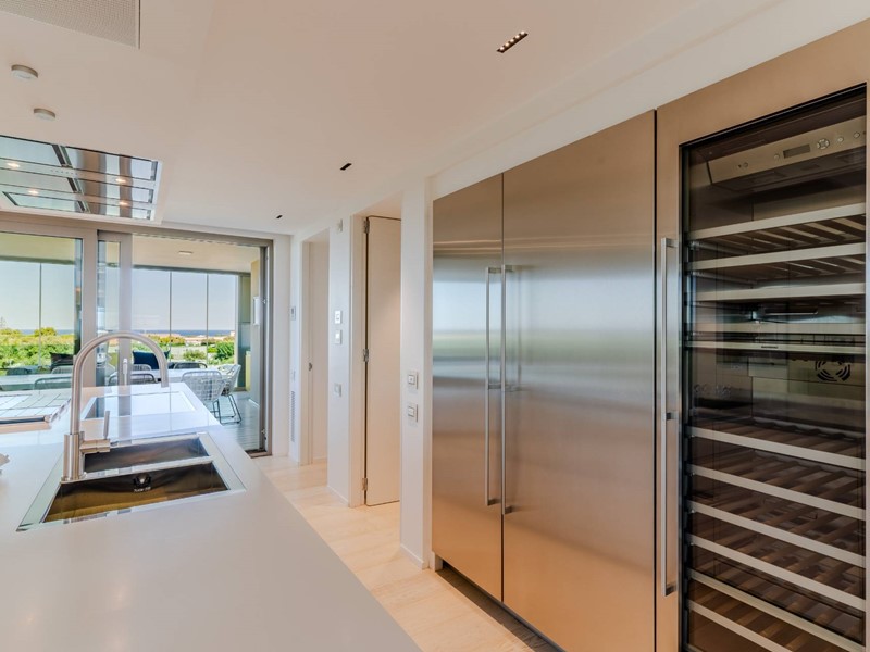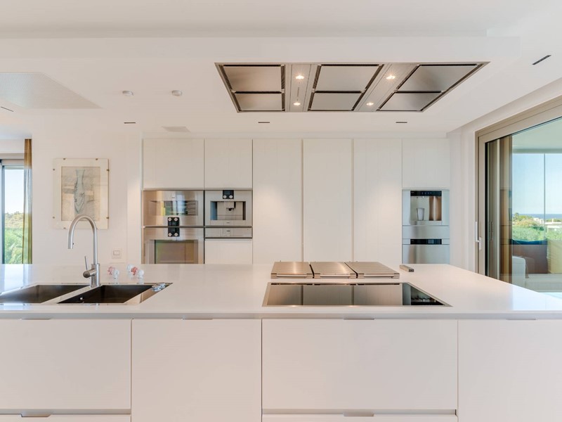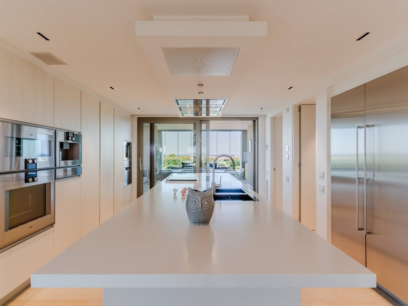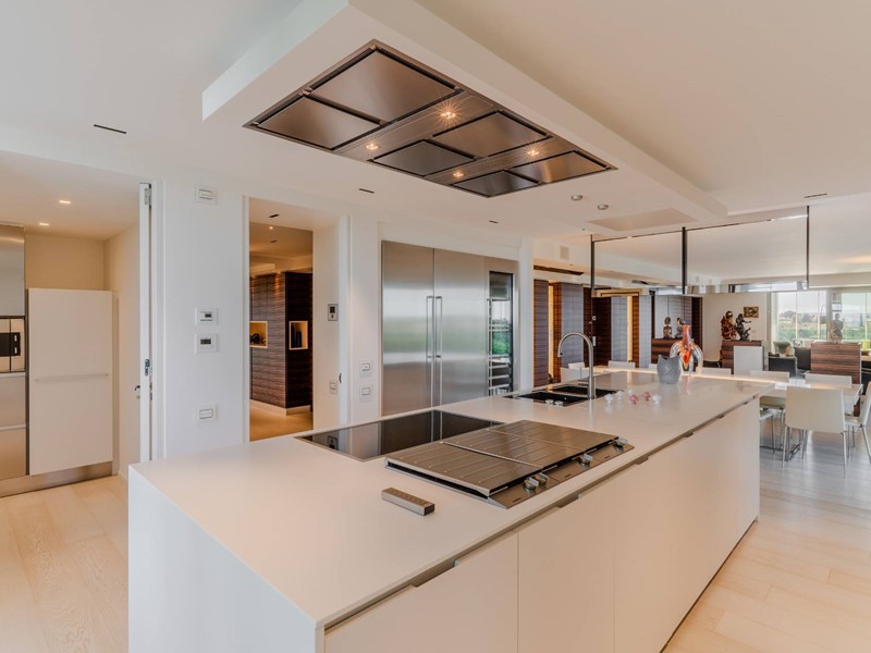 La cucina, marca Boffi, è il perfetto connubio tra design e funzionalità, con un elegante piano in Corian e dotata di elettrodomestici Gaggenau, sinonimo di eccellenza e tecnologia avanzata.