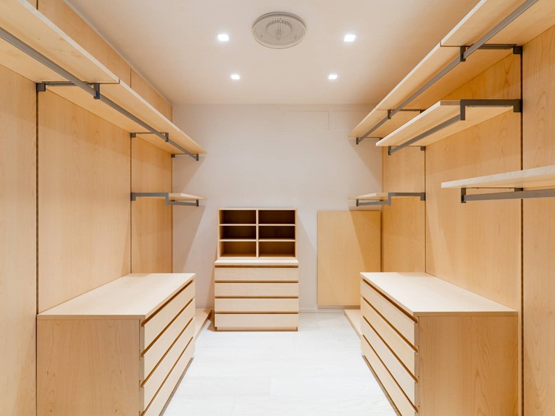 Gli arredi interni, realizzati artigianalmente, comprendono mobili in rovere impregnato bianco e ebano, arricchiti da raffinate quinte pivottanti in onice bianco iraniano lavorato a 2 cm per retroilluminazione, con telai in acciaio inox e basi in marmo bianco Sivec.