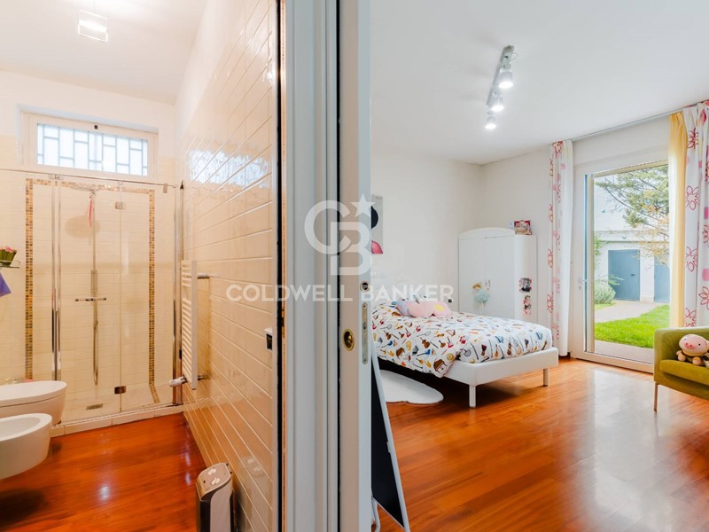 La prima unità, distribuita su due livelli, accoglie con un doppio salone ampio e luminoso, una cucina in muratura, una zona living con finestre panoramiche e una bellissima dependance con ampie porte-finestre che si affacciano sul giardino. La zona notte comprende due camere da letto, di cui una con bagno privato e cabina armadio, oltre a un secondo bagno. Al primo piano troviamo una comoda mansarda, lavanderia, ulteriore bagno e un ampio terrazzo con pannelli fotovoltaici.