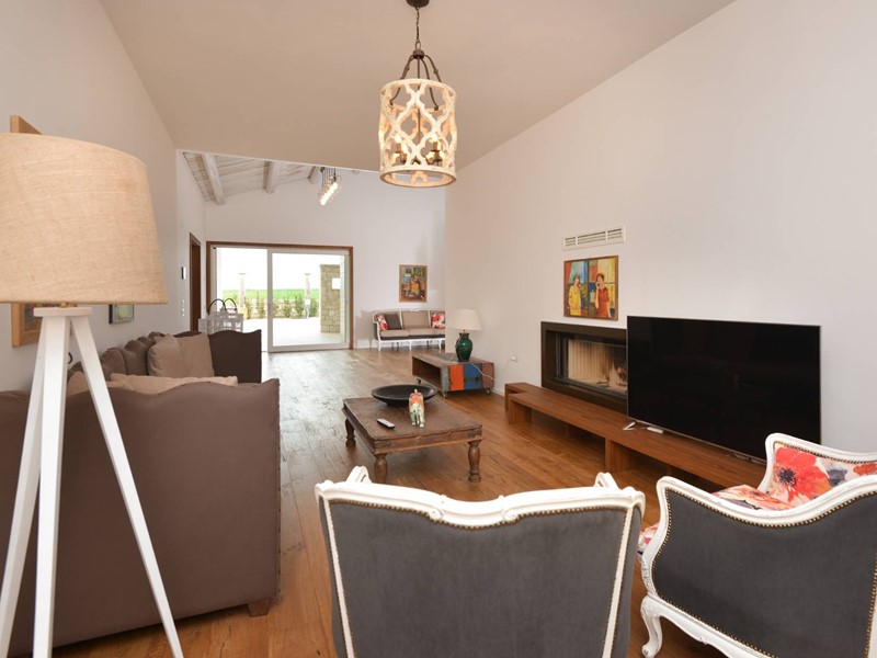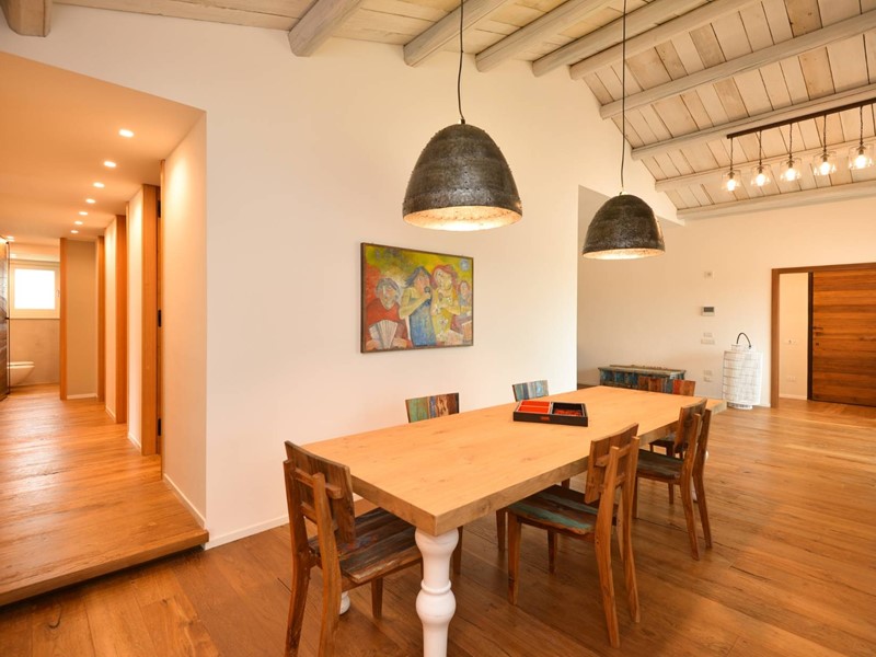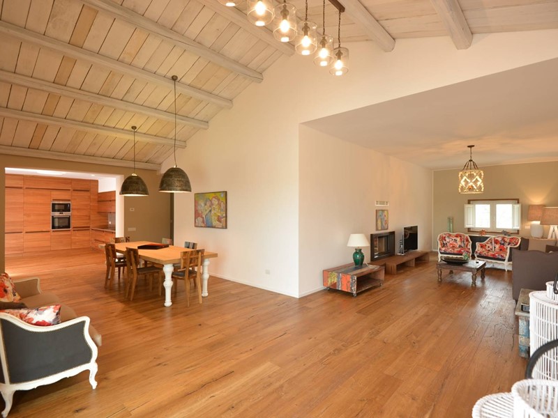 La residenza principale si sviluppa su una superficie coperta di circa 300 mq, distribuiti armoniosamente allinterno di un curato giardino di 4.300 mq, con ingresso carrabile e comoda area parcheggio. Gli interni si aprono su una luminosa zona giorno con pavimenti in parquet e grandi vetrate panoramiche che lasciano entrare la luce naturale e si affacciano sulla vegetazione circostante. Il salone con camino dialoga con lampia sala da pranzo e con la cucina separata, realizzata su misura in legno massello, offrendo ambienti caldi e funzionali ideali per la vita quotidiana e momenti conviviali. La zona notte ospita tre camere da letto e due bagni finemente rifiniti, garanzia di privacy e comfort per tutta la famiglia.
