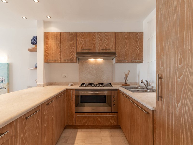 Distribuito su due livelli sapientemente progettati, lappartamento accoglie con un ampio open space al piano terra. La cucina moderna e completamente attrezzata si apre su un raffinato soggiorno con ampie vetrate a tutta altezza che conducono a una terrazza coperta panoramicalo spazio ideale per pranzi allaperto o aperitivi al tramonto sul mare. A completare il piano, un bagno per gli ospiti e una comoda zona ripostiglio.