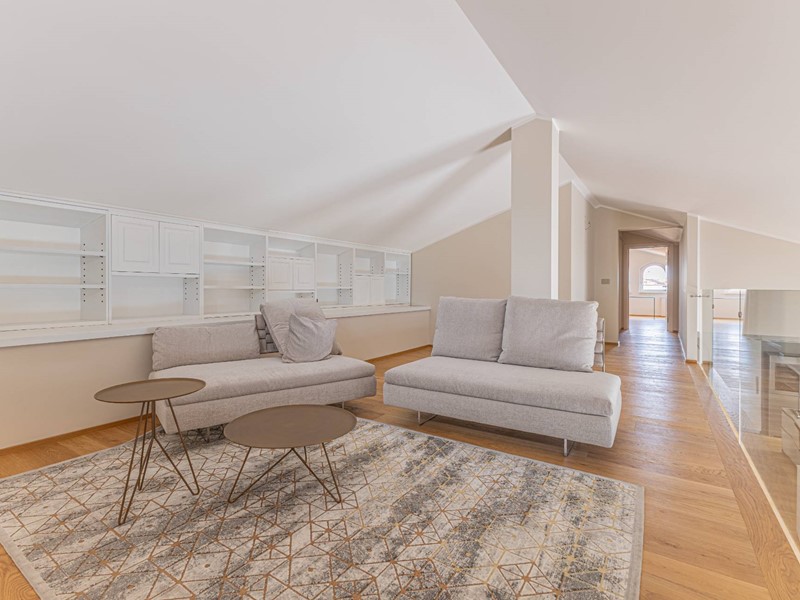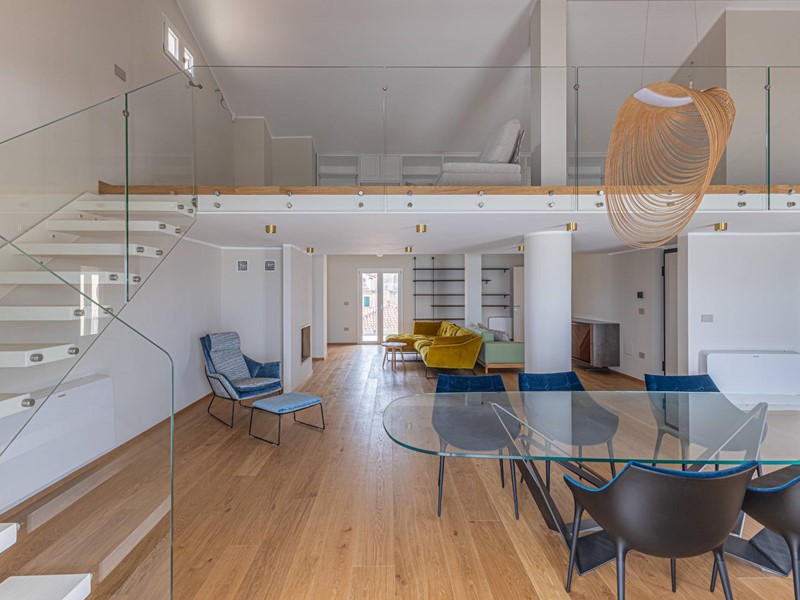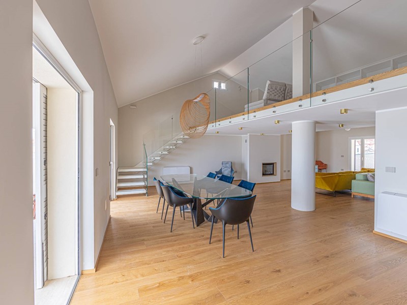 Un ulteriore valore aggiunto è il soppalco al piano superiore, dove trovano spazio una zona relax e una terza camera da letto con bagno privato  perfetta come suite per ospiti o studio riservato.
