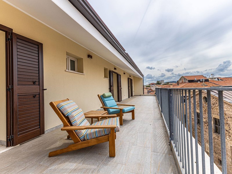 I due ampi terrazzi, ciascuno di circa 50 mq, offrono una delle viste più straordinarie della città: a est la Cattedrale di Santa Maria, a ovest il porto e il mare di Alghero che si accende di colori al tramonto. Qui la luce naturale è protagonista, dal mattino alla sera.