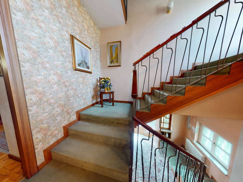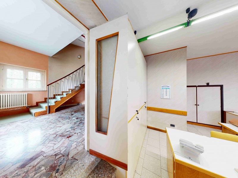 L'ingresso al piano terreno presenta un ARIOSO ATRIO che accoglie l'imponente VANO SCALA che sale fino al piano solaio.