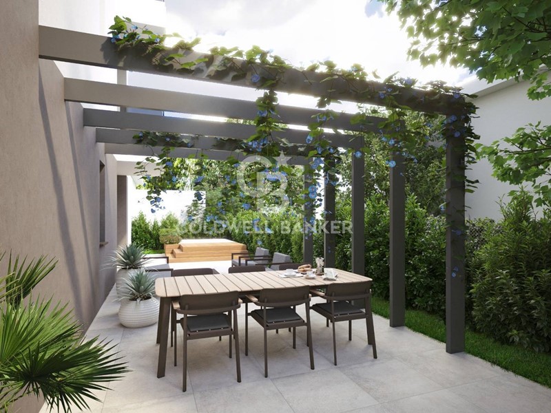 Internamente l'appartamento si compone di soggiorno con cucina a vista, due camere e due bagni; ogni ambiente si affaccia sul giardino in parte pavimentato per renderlo più funzionale e a servizio della famiglia.