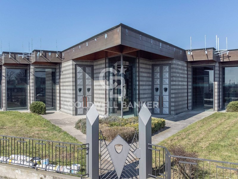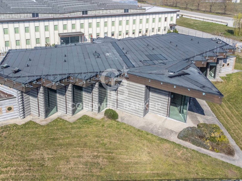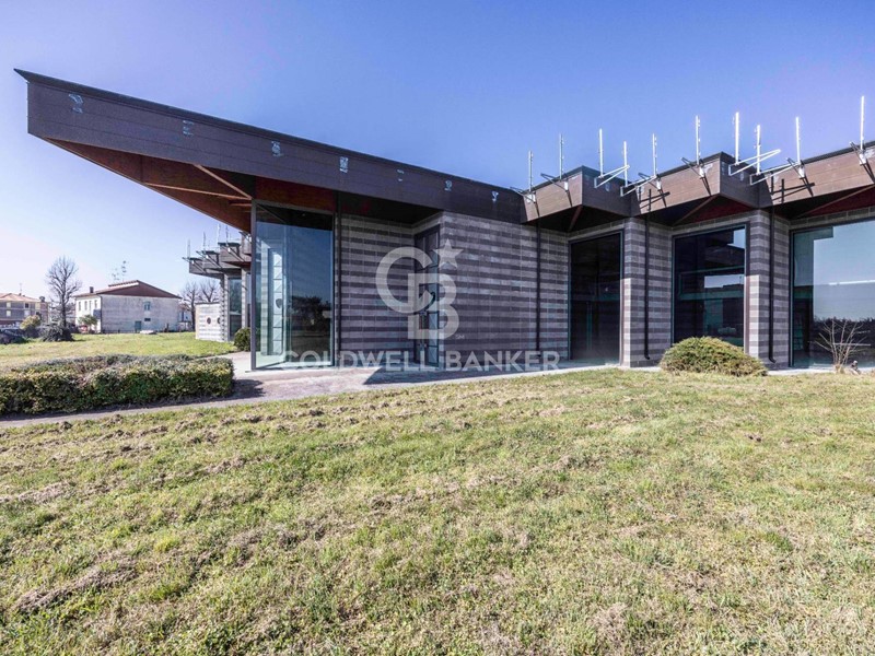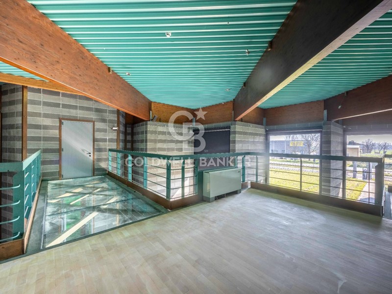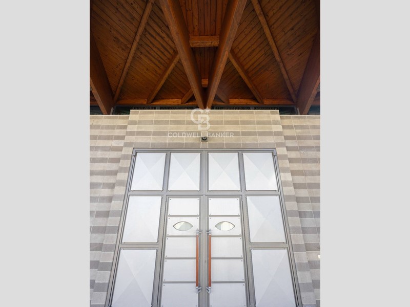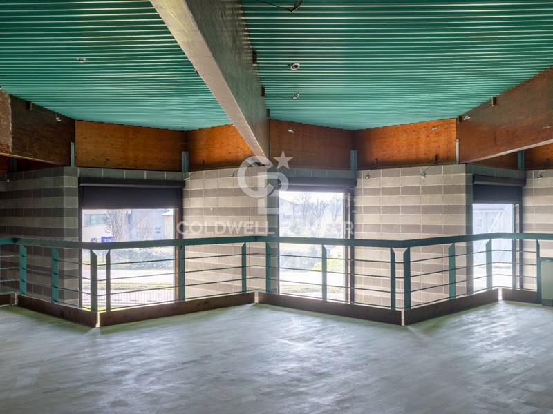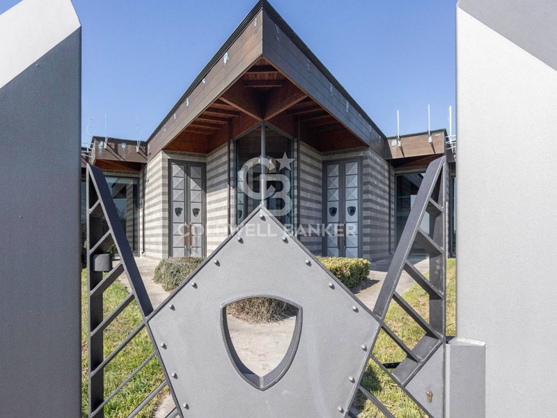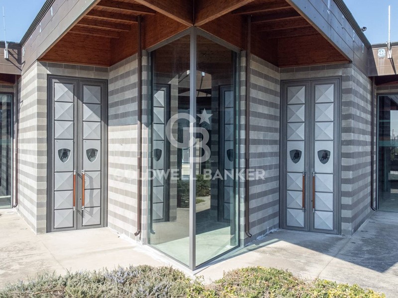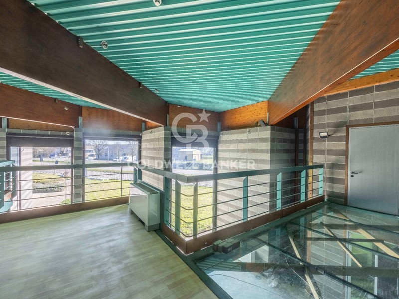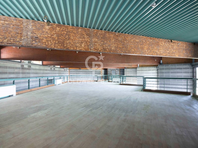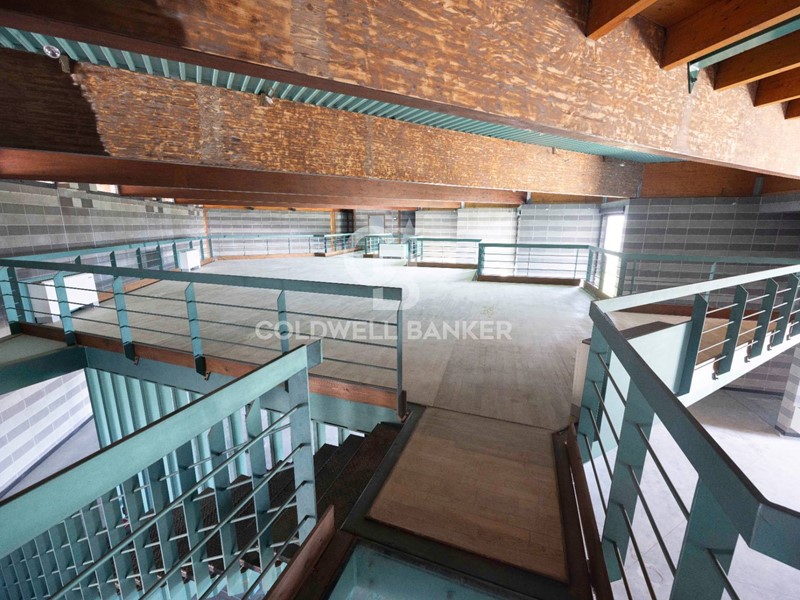 La proprietà si estende su una superficie di circa 1300 mq, circondata da un elegante giardino di 1500 mq. Al suo interno, ledificio è strutturato in un ampio open space, con un soppalco di 320 mq e tre spaziosi bagni di servizio. La particolare progettazione architettonica permette di sfruttare al meglio la luce naturale, che illumina lintero spazio grazie a otto grandi vetrine. Lutilizzo del "lecablocco", un materiale innovativo con fasce cromatiche alternanti grigio perla e grigio antracite, dona alla struttura una geometria pulita ed equilibrata, garantendo al contempo un'ottima performance in termini di isolamento termico e un impatto estetico distintivo.