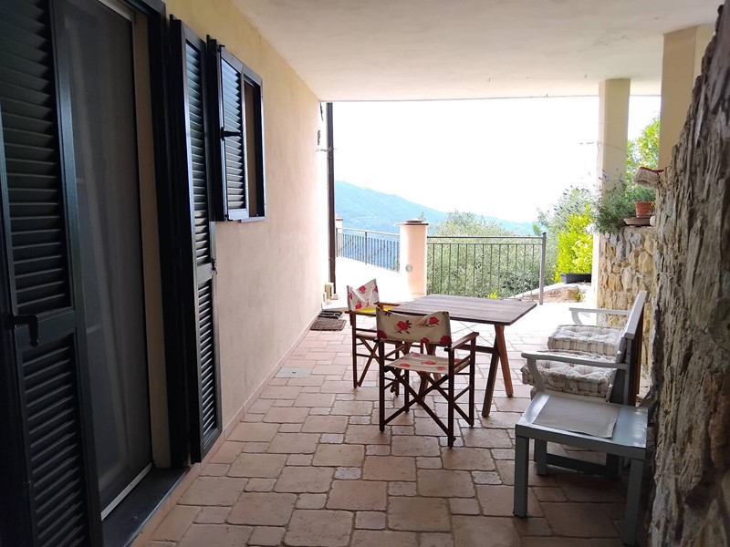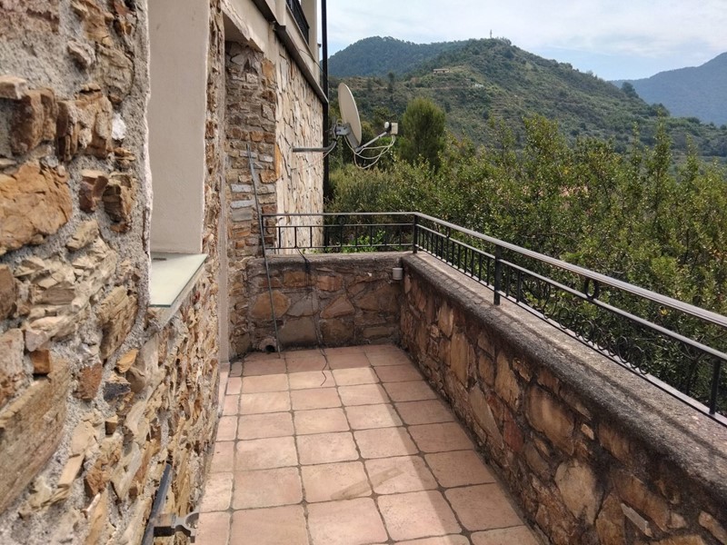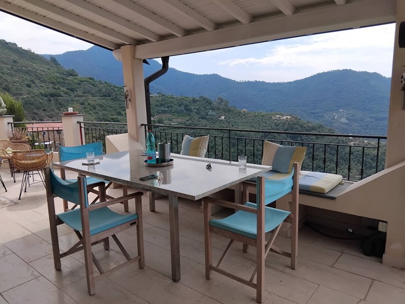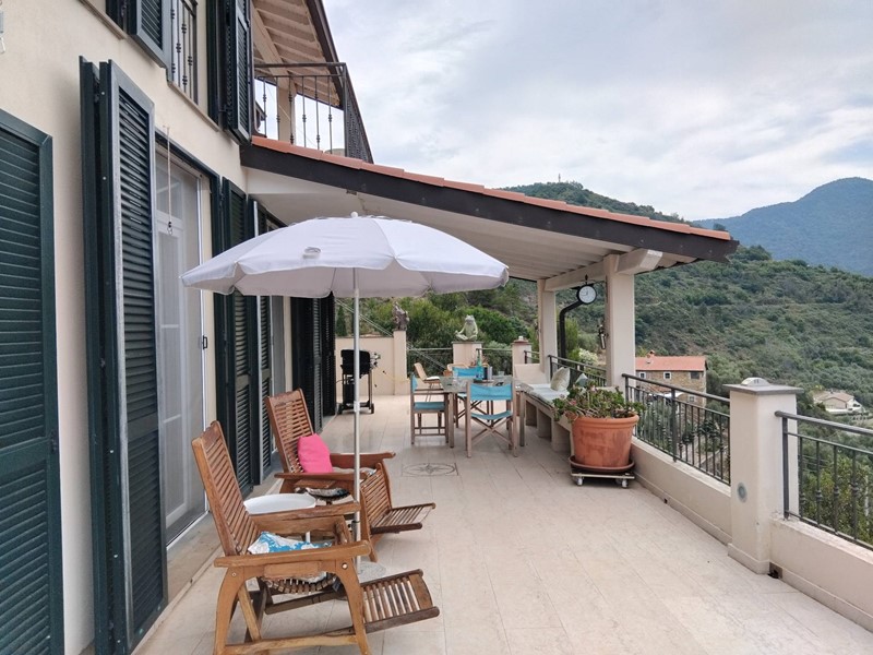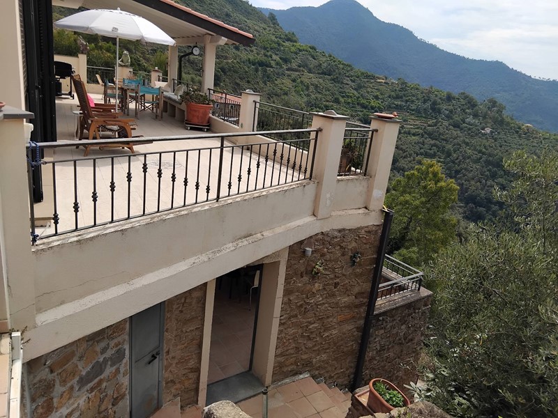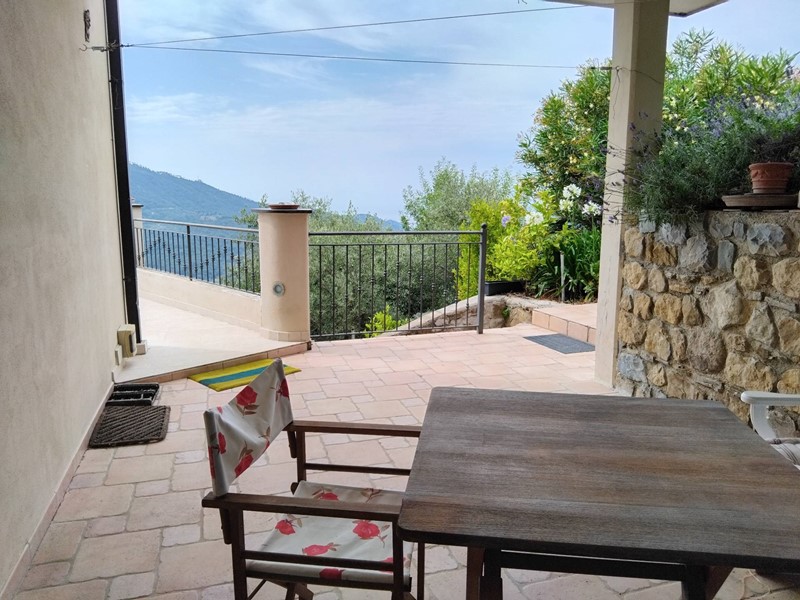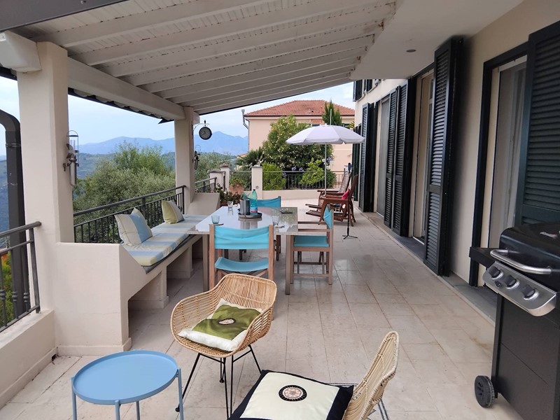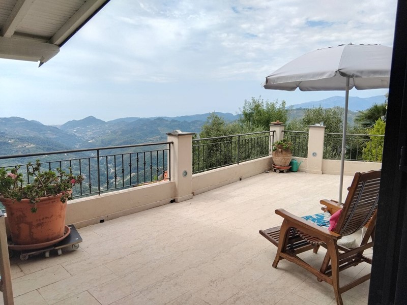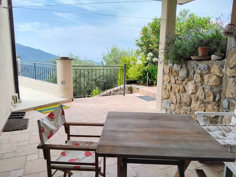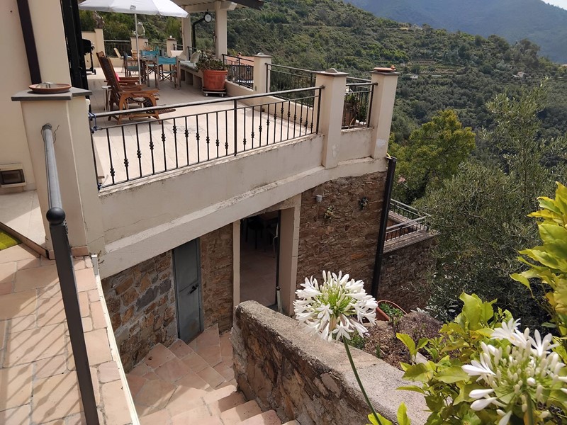 Appartamento in villa con posto auto privato, zona residenziale strada Begliun a Perinaldo, entrata in comune con cancello per due appartamenti opposti, livello piano uno sotto strada, grandissimo seminterrato dietro la proprietà ad uso cantina o a desiderio, ampio soggiorno con cucina a vista con isola con tutta parete finestrata sulla grande terrazza con vista mare, la terrazza prende tre lati dell'appartamento, con vari spazi per godersi il sole o un pò di ombra nei momenti più caldi, le scale esterne portano ad uno studio indipendente con balcone, esterno in pietra e vista mare, intorno troviamo pezzi di giardino e un'altra cantina alta completamente in pietra e a volta sotto lo studio.