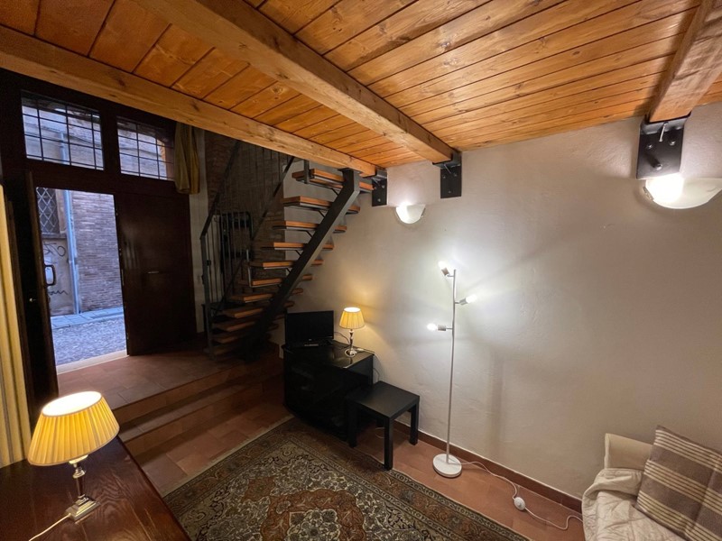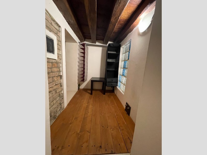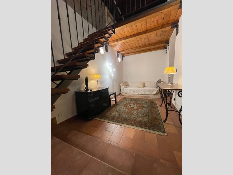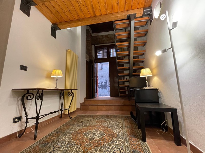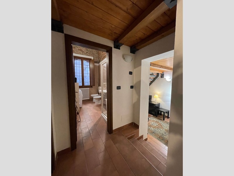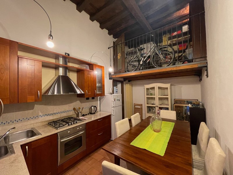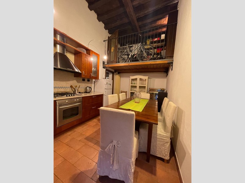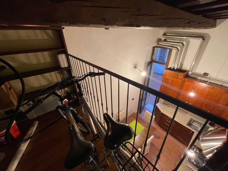 Attualmente disposto con: ingresso su salotto, disimpegno, grande cucina abitabile con uscita sul chiostro interno, ampia camera da letto matrimoniale, bagno finestrato con doccia. Soppalco sopra la zona salotto che funge da studio o eventuale seconda camera da letto e soppalco attiguo con affaccio sopra la cucina. Immobile Soggetto a vincolo storico artistico. Infissi in legno, riscaldamento autonomo. Dotato di Arredo cucina.