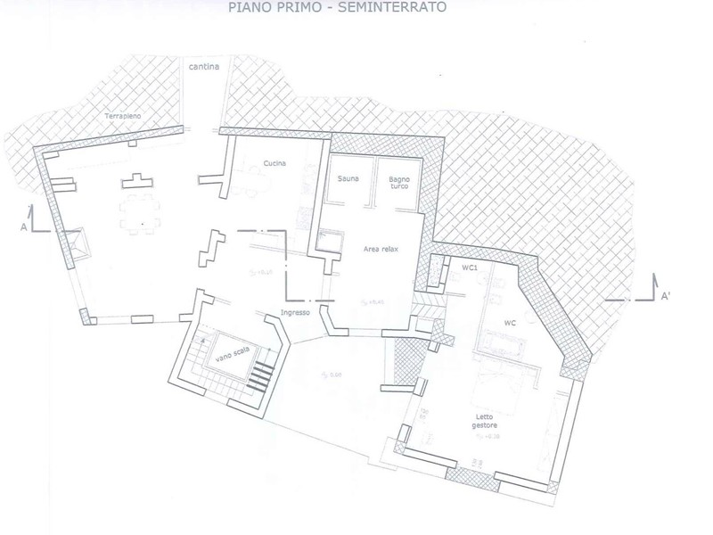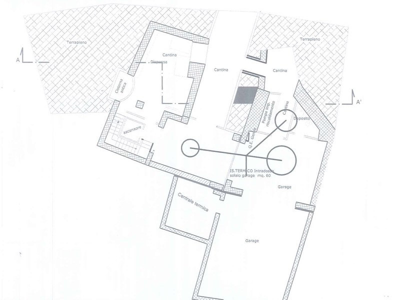 Il Piano terra Garage-Cantina è interrato su tre lati. I posti auto variano da 3 a 4. Sul solaio di copertura del Garage e del locale tecnologico è stato realizzato un giardino pensile, antistante al piano superiore. Nella zona più interna, sono presenti una cantina-dispensa, un'antica Cantina in pietra. Completano il piano, due grandi locali scavati a mano nella roccia arenaria del sito intorno all'anno 1100, con forma "a capanna" che hanno conservato nella volta numerose conchiglie marine.