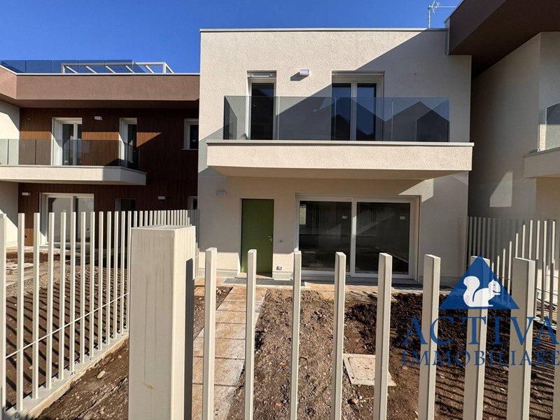La villetta, posta centralmente, è composta al piano terra da ingresso con ampio e luminoso soggiorno/letto con cucina a vista, disimpegno e bagno a servizio del piano, la scala interna in serizzo conduce alla zona notte al piano primo (agibile) dove sono presenti altri tre locali, tutti con affaccio sul balcone oltre ad uno spazioso bagno. Mentre al piano interrato troviamo un'ampia cantina dalla quale si accede direttamente al box doppio in larghezza dotato di elegante portone sezionale motorizzato. Inoltre avrai un ampio giardino di mq 150 circa sui due lati paralleli dell'abitazione, dove poter trascorrere il tempo libero in perfetta tranquillità. La costruzione avrà finiture moderne e sarà caratterizzata dalla scelta di materiali di alta qualità che garantiscono il risparmio energetico certificato da una classe energetica A, il comfort di una casa di ultima generazione, la modernità delle scelte architettoniche e di capitolato che qui in pillole Vi forniamo: portoncino d'ingresso blindato di sicurezza antifrazione con pannello interno bianco ed esterno verde petrolio, porte interne colori bianco, rovere e ciliegio, serramenti in PVC con vetrocamera ed anta a ribalta, tapparelle in alluminio coibentato motorizzate, impianto di riscaldamento a pannelli radianti con pompa di calore autonoma di marca Mitsubischi o Samsung per singola villetta, riscaldamento a pavimento sui tre piani con termostato su ogni piano, scaldasalviette nei bagni, sanitari sospesi, ceramiche in grès porcellanato per la zona giorno al piano terra e grès porcellanato effetto legno per i locali a piano primo, predisposizione impianto di condizionamento canalizzato, predisposizione impianto di allarme, impianto fotovoltaico per ogni singola villetta, videocitofono e molto altro ancora!