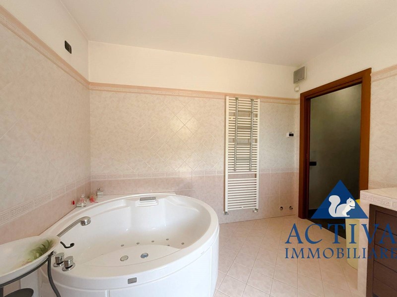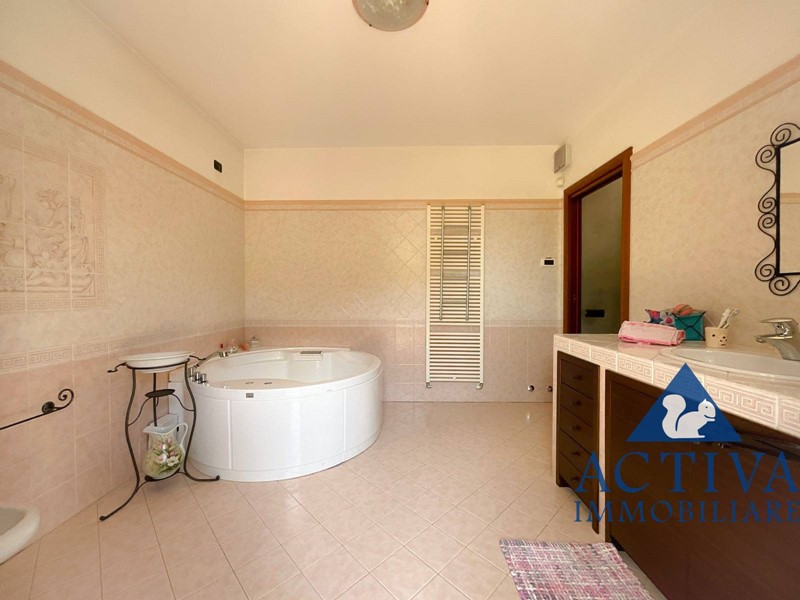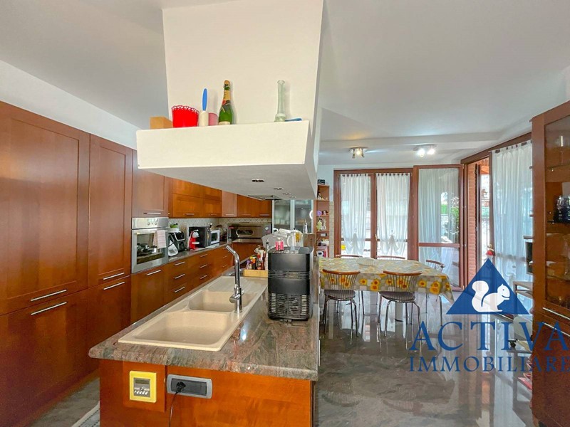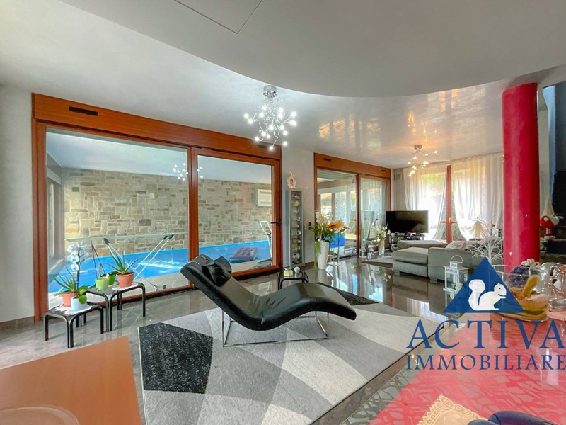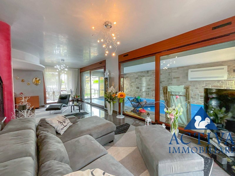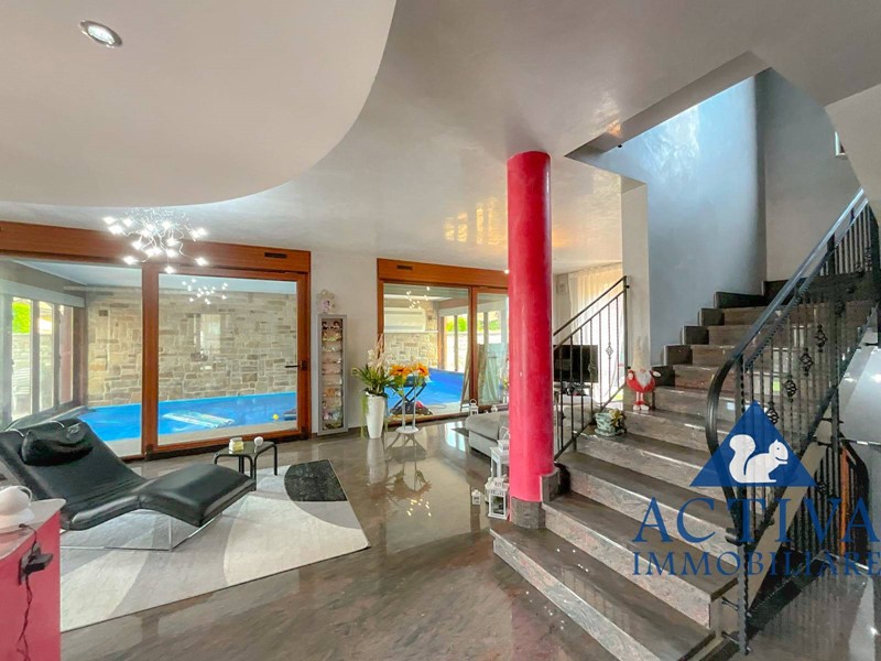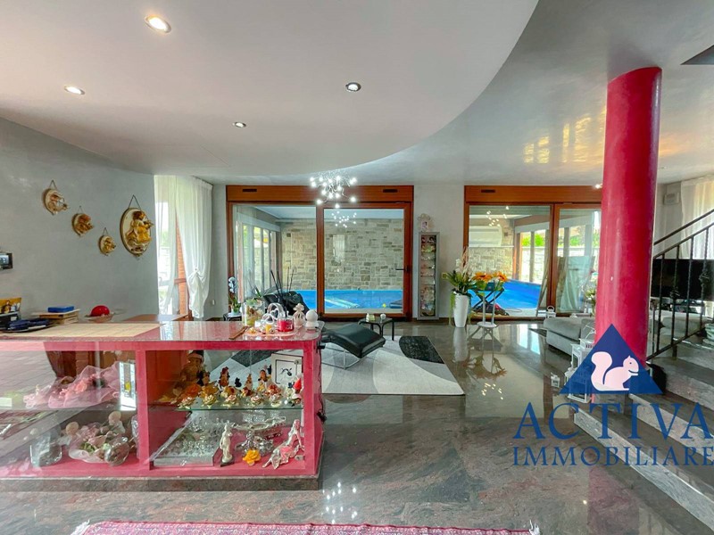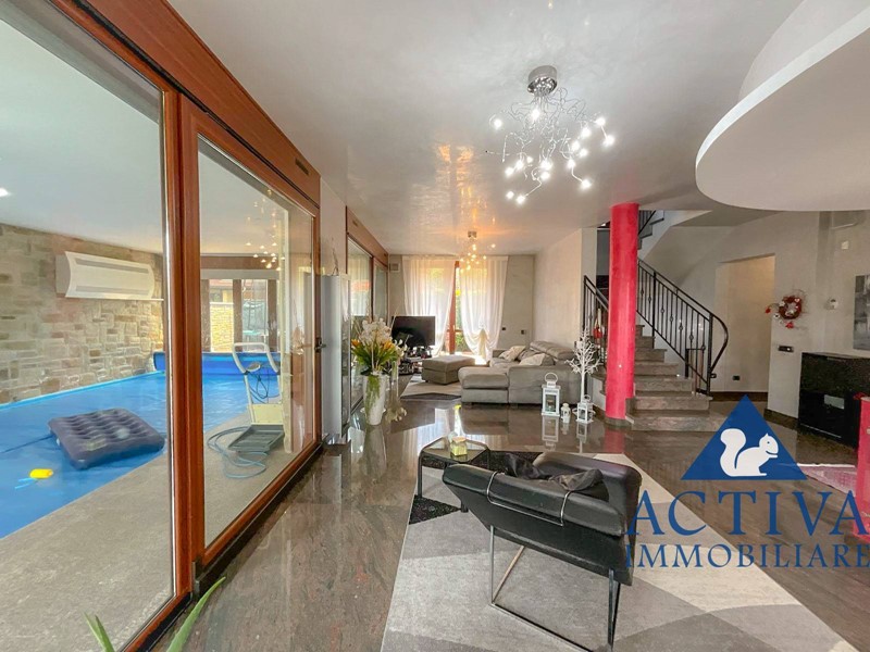 La villa, con una superficie di circa 350 mq, si sviluppa su tre livelli collegati da una scala interna, offrendo spazi generosi per soddisfare le esigenze di tutta la famiglia. All'ingresso, un ampio e suggestivo portico conduce al luminoso soggiorno, caratterizzato da una scenografica vetrata con vista sulla piscina coperta. La cucina abitabile, dotata di un'elegante isola centrale, è perfetta per preparare deliziosi pasti in famiglia. Completano il piano terra una sala da bagno con vasca idromassaggio angolare e un comodo ripostiglio, con accesso diretto al giardino privato da entrambi i lati.