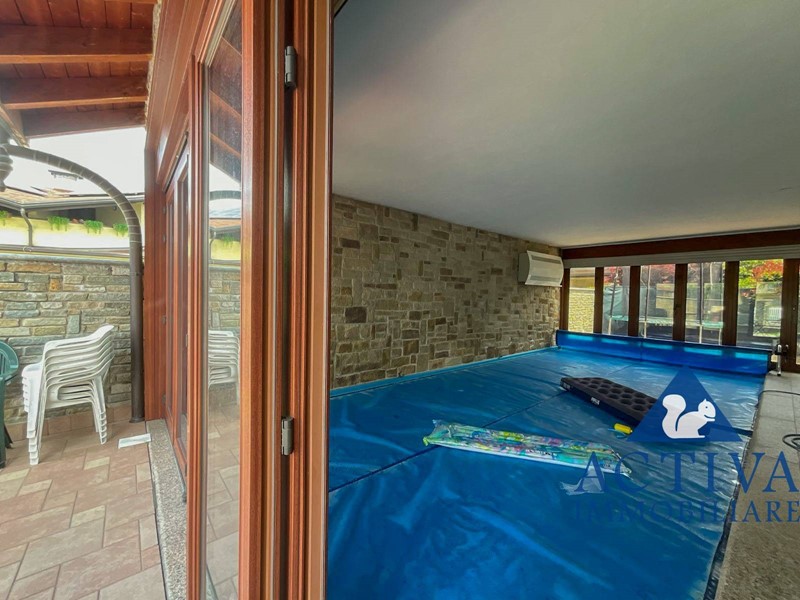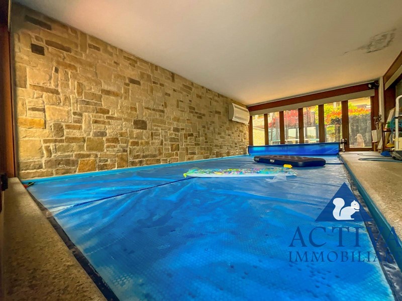 La piscina coperta, un vero gioiello della proprietà, dispone di ampie vetrate apribili che permettono di godere del giardino anche durante le giornate più fredde, grazie al sistema di riscaldamento dell'acqua. Salendo al primo piano, si trovano tre camere da letto, di cui una con cabina armadio, un bagno e un disimpegno. Le camere sono collegate a due ampi terrazzi e due balconi, offrendo ulteriori spazi all'aperto dove rilassarsi e trascorrere piacevoli momenti di svago.