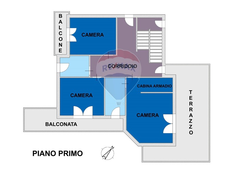 - piano primo, tramite comoda scala interna si accede al piano superiore dove troviamo, una camera matrimoniale con cabina armadio e bagno privato, dotata di accesso al terrazzo a livello, altre due camere (di cui una con balcone) e altro bagno
