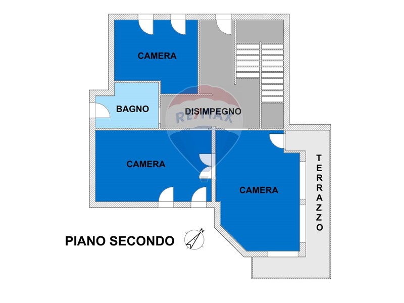 - piano secondo, prima camera con accesso al terrazzo, seconda e terza camera con finestre e bagno.