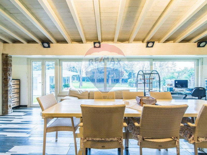Da qui si procede verso un un favoloso portico con vetrate scorrevoli con affaccio sul giardino e la zona piscina ideale per feste estive senza rinunciare alla riservatezza.