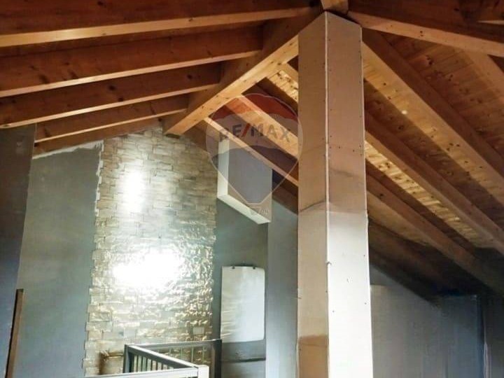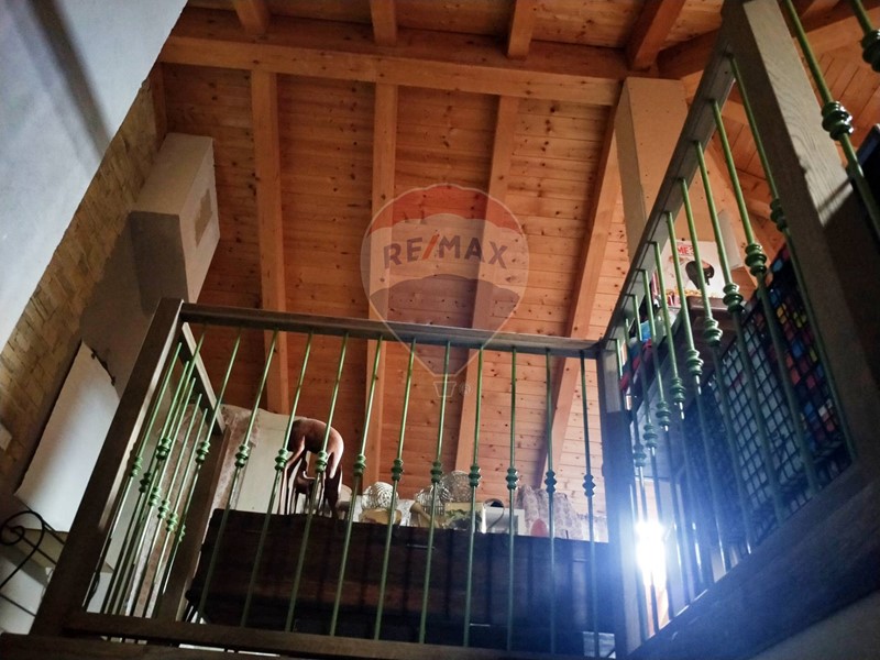 Dal soggiorno fa capolino la STUFA A PELLET posta sulla scala rivestita in legno che conduce al SOTTOTETTO.