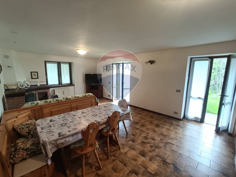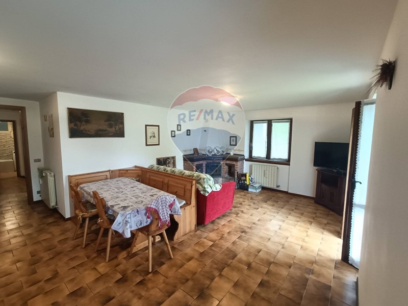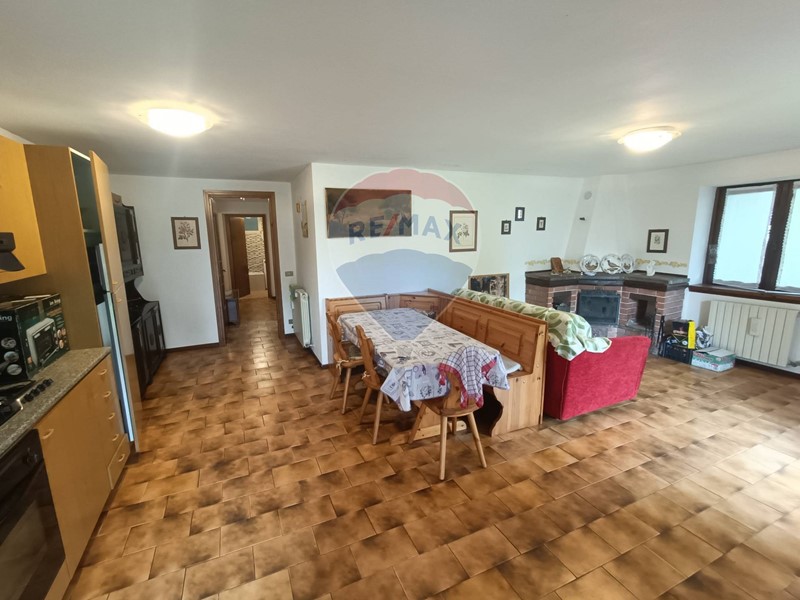Ingresso nell'ampia zona giorno con cucina a vista, dove troviamo una cucina lineare, un tavolo per pranzare, un divano e un utile camino a legna, adatto sia per scaldare che per creare la classica atmosfera da montagna.