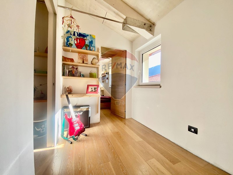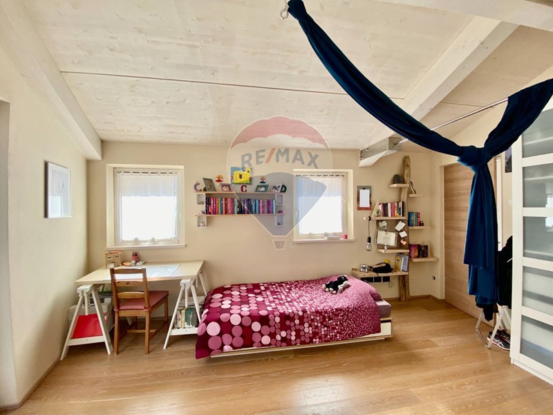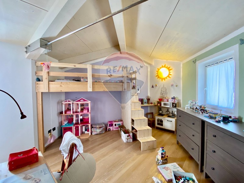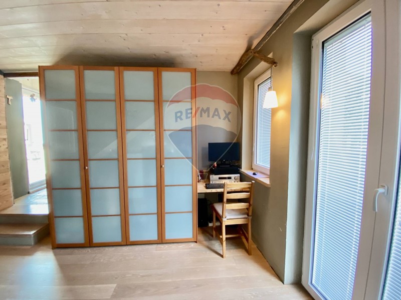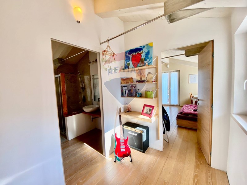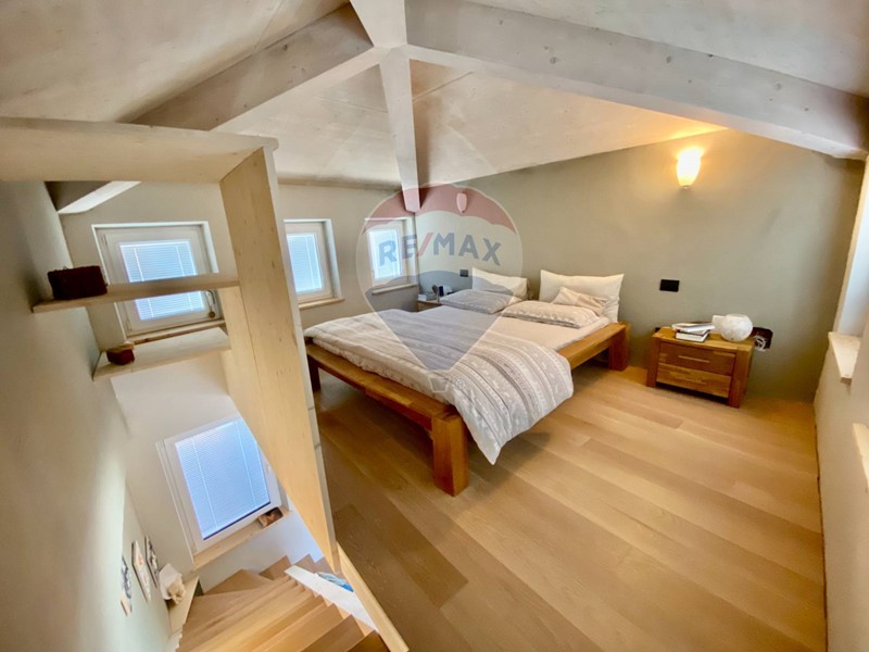 Dalla bellissima cucina vi è accesso alla camera padronale matrimoniale. Questa camera si sviluppa su due livelli, come fosse la torretta di un castello. Nella parte a piano primo, adiacente alla cucina vi è lingresso alla camera con cabina armadio, ufficio e bagno privato, al secondo livello soppalcato si trova invece la zona notte con letto matrimoniale.