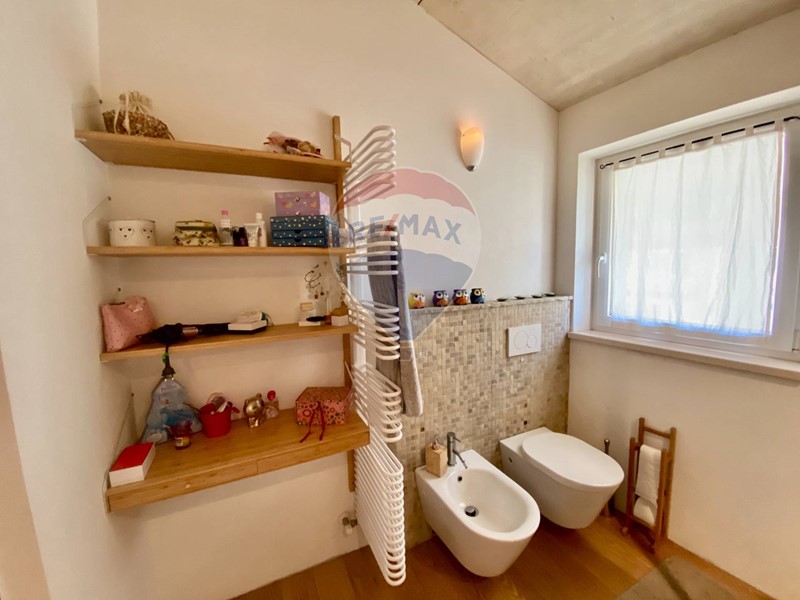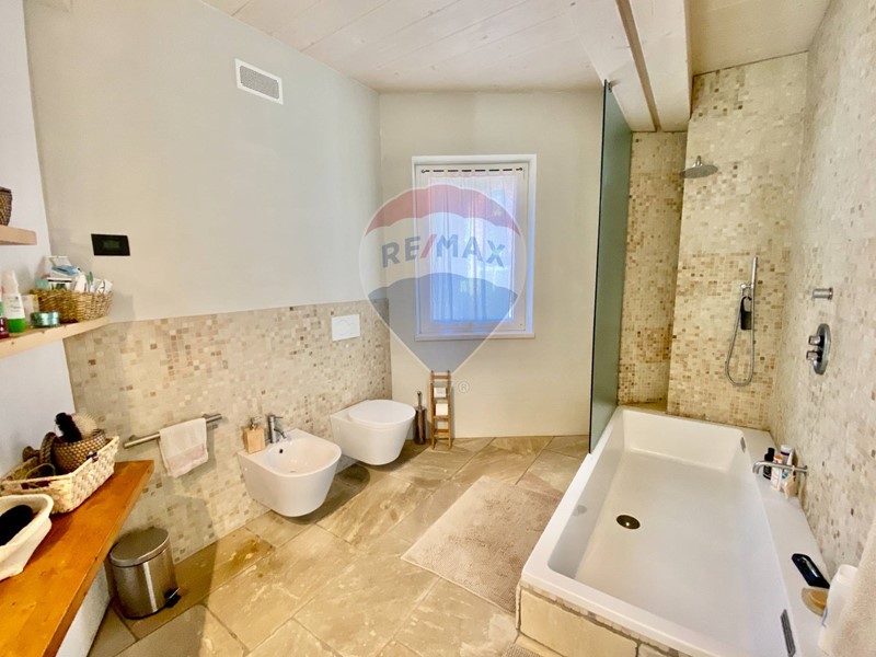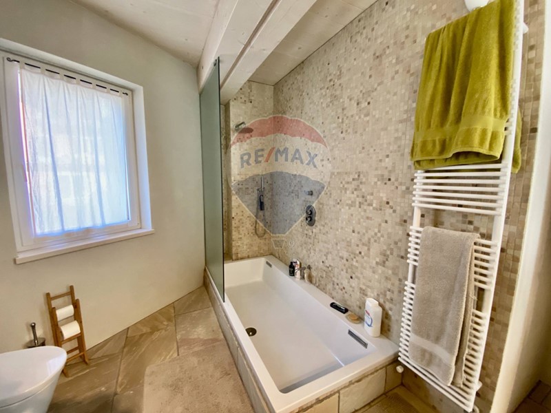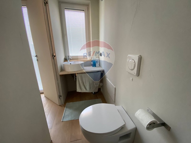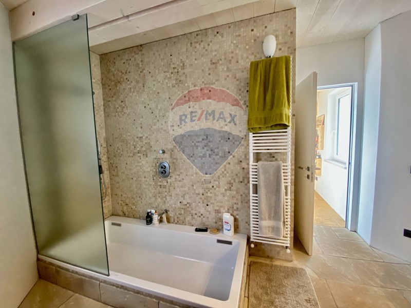 Dal soggiorno si accede al bagno principale con vasca di ultima generazione e accessori di alta gamma. Adiacente ad esso si trova il locale lavanderia/ripostiglio