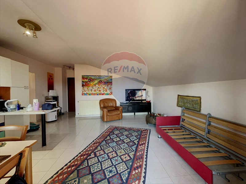 L'ingresso si apre su un accogliente soggiorno con cucina a vista, perfetto per momenti di relax e convivialità, che si affaccia su un balcone dal quale è possibile godere di una piacevole vista panoramica.
