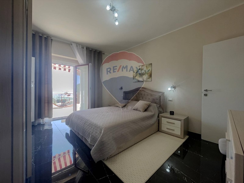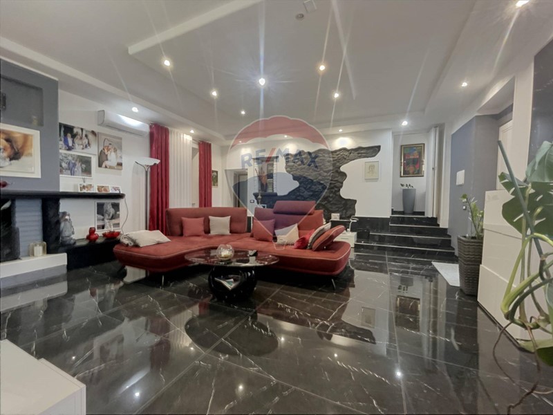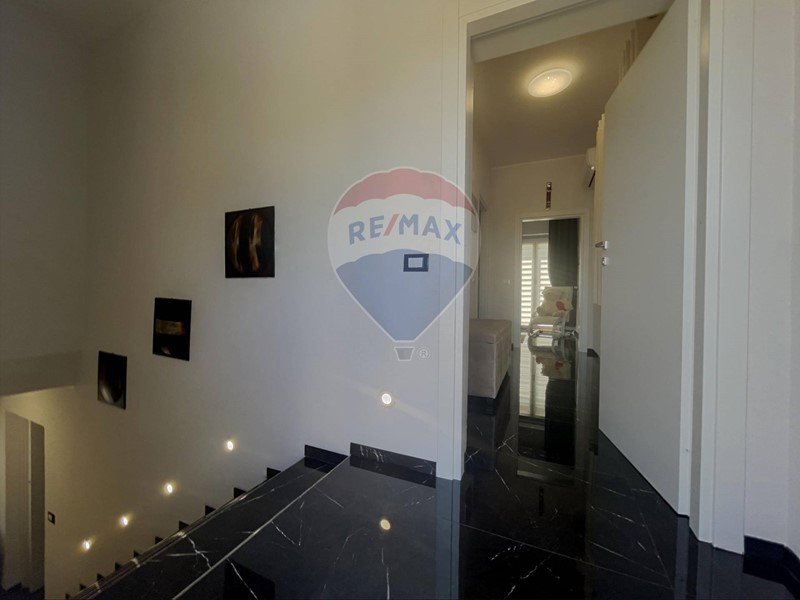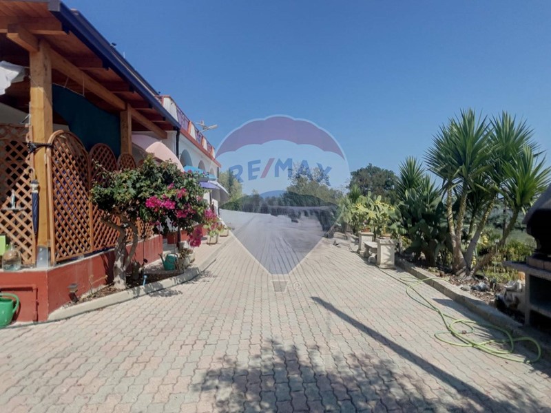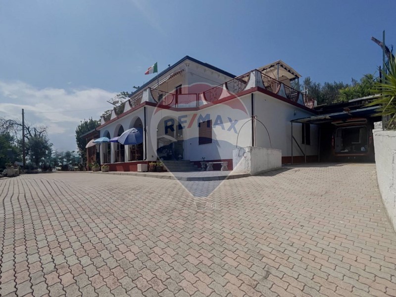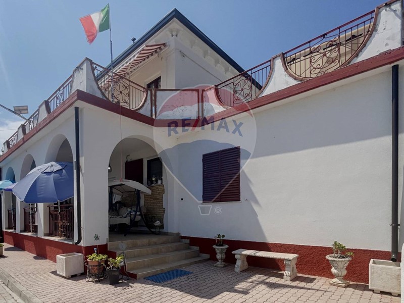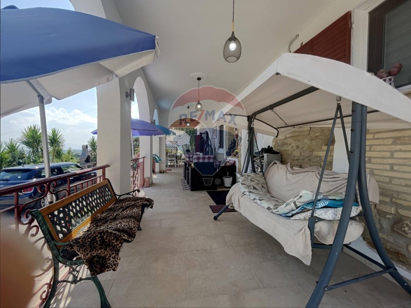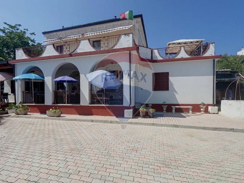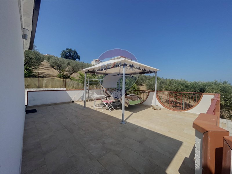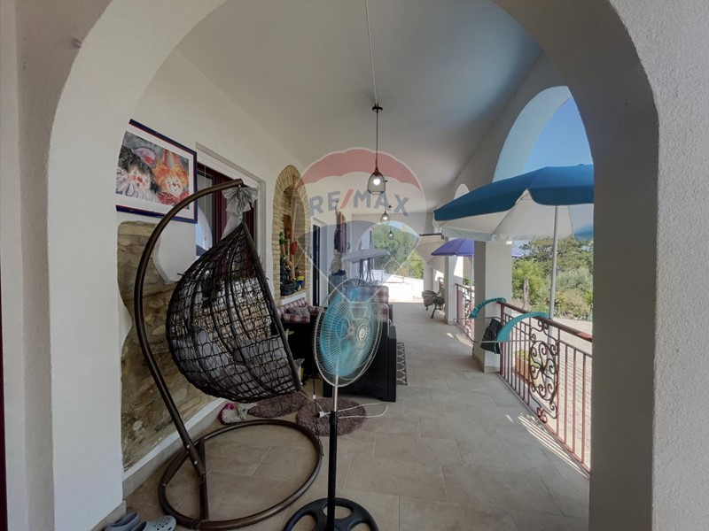 Composizione: Piano terra, doppio ingresso con grande soggiorno e camino di design, sala da pranzo, cucina abitabile, tinello con dispensa e cantina, corridoio con accesso alla sala da bagno con vasca e doccia, camera da letto principale con cabina armadio; al Piano superiore si accede da una lussuosa scala con generoso disimpegno per altre tre camere da letto, studio ed altro bagno; da ogni stanza si accede ai due terrazzi VISTA MARE collegati da un altro grande balcone da cui si gode la vista della vallata e del mare a 180°; completano la proprietà un giardino, un terreno esclusivo con possibilità di realizzare una piscina ed un altro fabbricato, forno pizza/pane e tutta una copertura circostante l'immobile attualmente utilizzato con rimessa, deposito, magazzino e parcheggio camper.