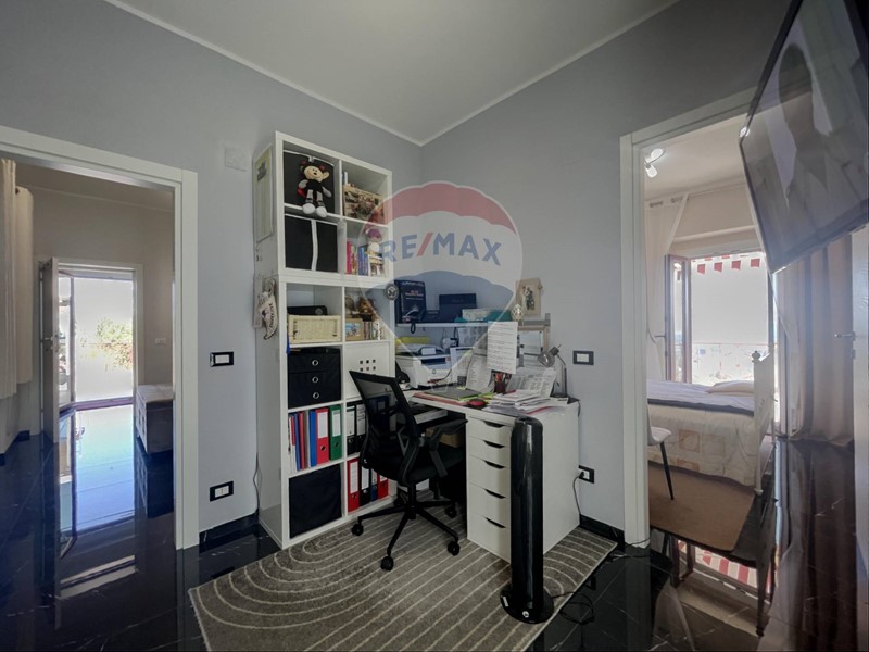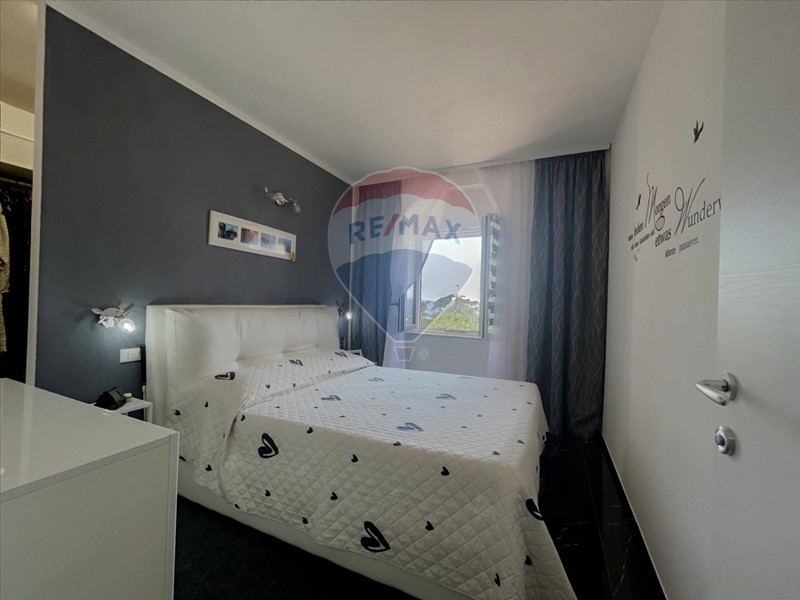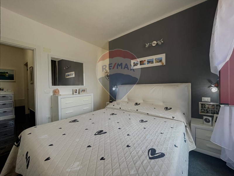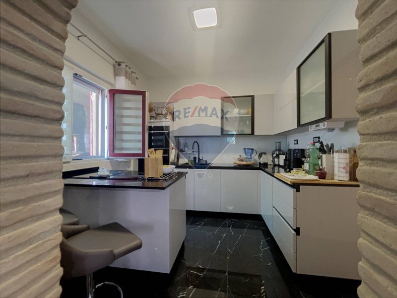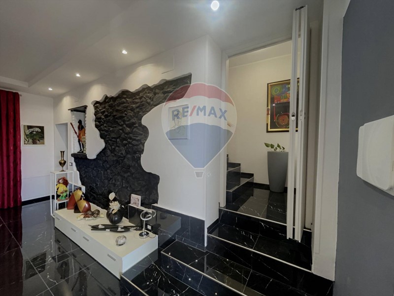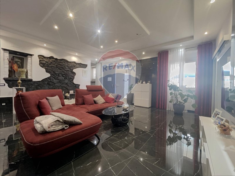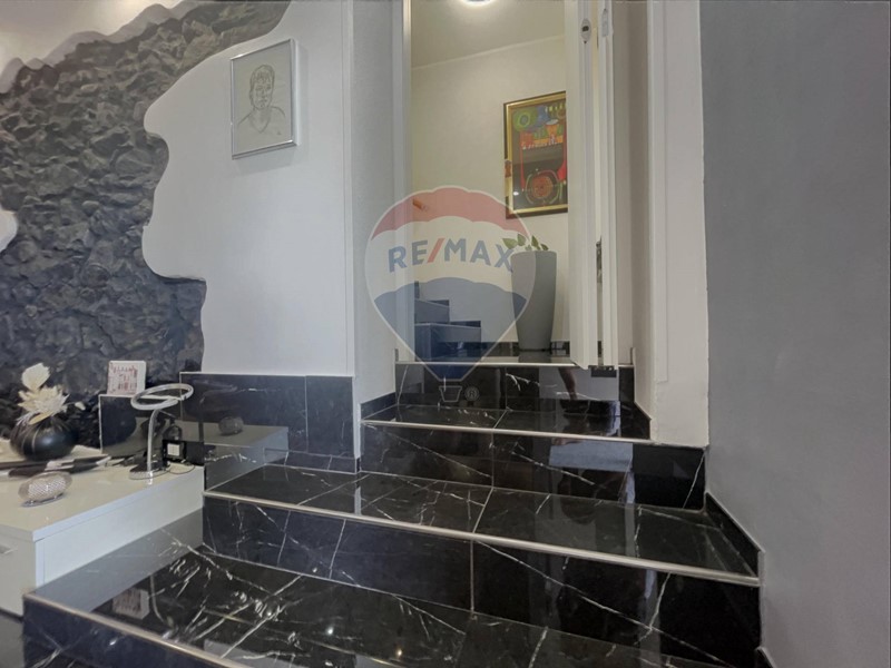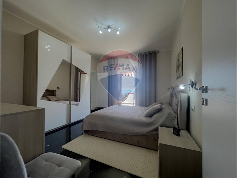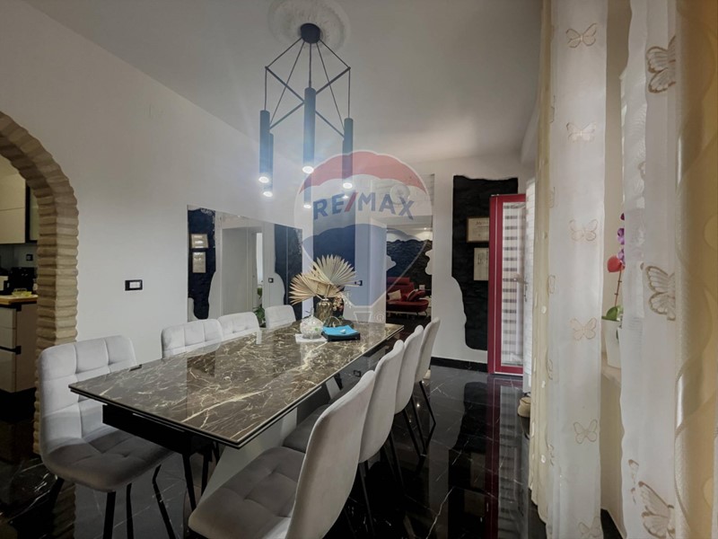 Composizione: Piano terra, doppio ingresso con grande soggiorno e camino di design, sala da pranzo, cucina abitabile, tinello con dispensa e cantina, corridoio con accesso alla sala da bagno con vasca e doccia, camera da letto principale con cabina armadio; al Piano superiore si accede da una lussuosa scala con generoso disimpegno per altre tre camere da letto, studio ed altro bagno; da ogni stanza si accede ai due terrazzi VISTA MARE collegati da un altro grande balcone da cui si gode la vista della vallata e del mare a 180°; completano la proprietà un giardino, un terreno esclusivo con possibilità di realizzare una piscina ed un altro fabbricato, forno pizza/pane e tutta una copertura circostante l'immobile attualmente utilizzato con rimessa, deposito, magazzino e parcheggio camper.