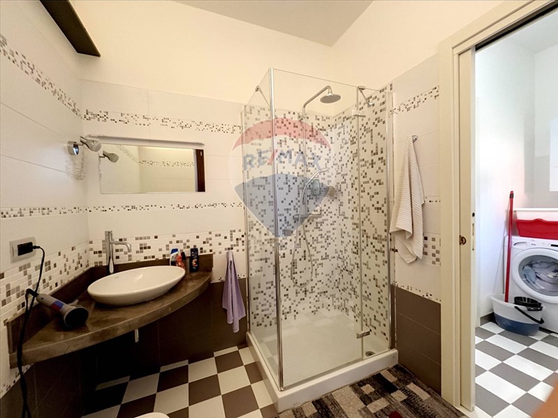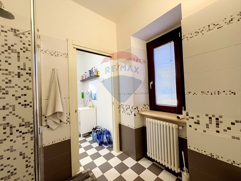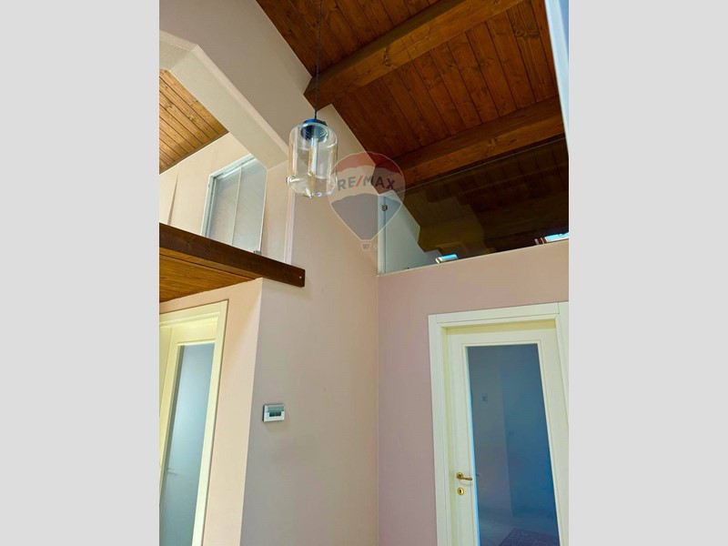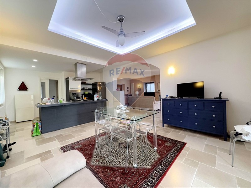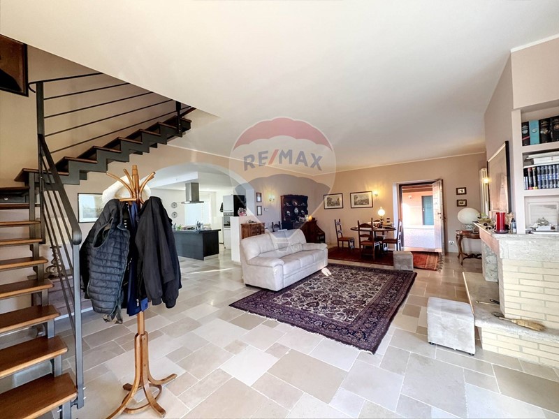Da qui si accede al luminoso living con caminetto, adiacente troviamo, la cucina attrezzata con isola e frontalmente l'ampia e luminosa zona pranzo, al piano, un servizio con antibagno-lavanderia.