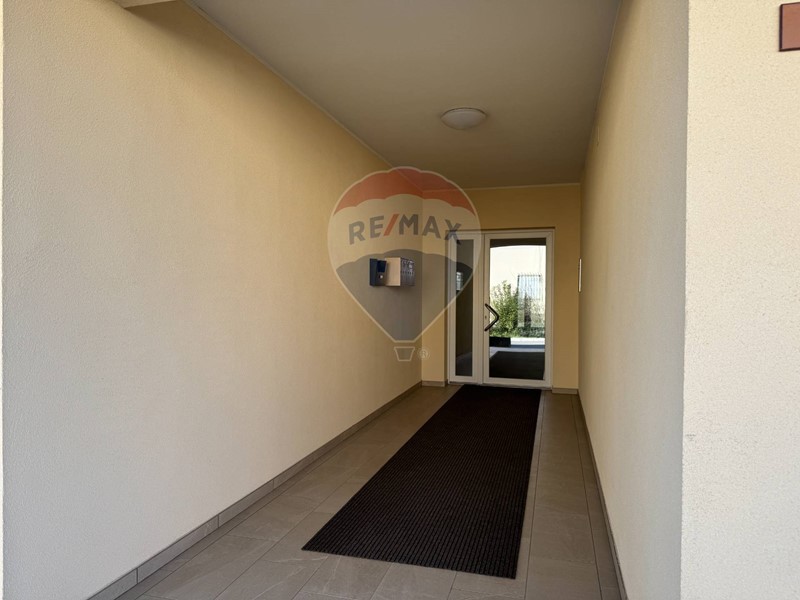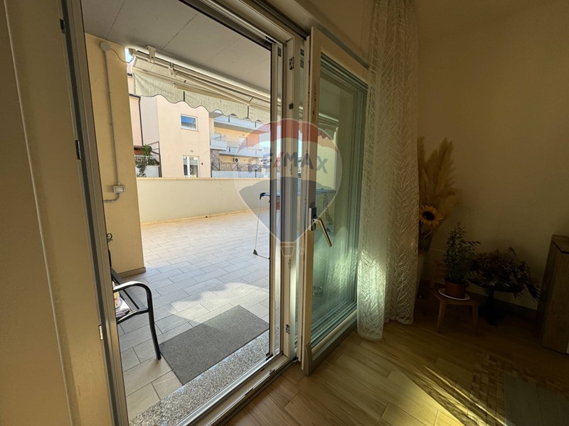 L'ingresso principale si apre su un ampio e luminoso soggiorno dotato di grandi finestre scorrevoli che garantiscono una perfetta illuminazione naturale. Dalle stesse si accede ad un grande terrazzo esterno.