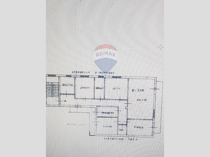 -ingresso su saletta, prima camera, corridoio, seconda camera, bagno, terza camera, salone doppio con balcone, quarta camera da letto, ripostiglio, cucina, ripostiglio e per finire lavanderia