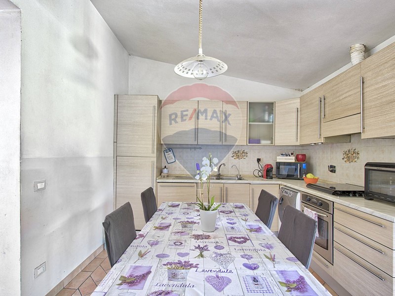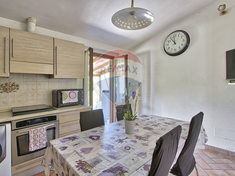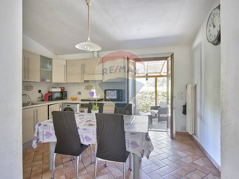 La cucina, abitabile e attrezzata, si affaccia su una graziosa veranda, perfetta per rilassarsi e godere della vista sul giardino privato.