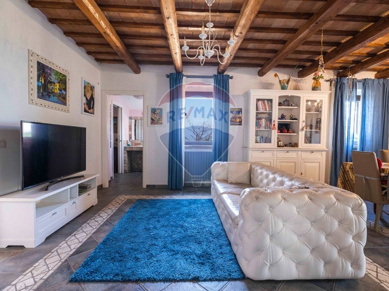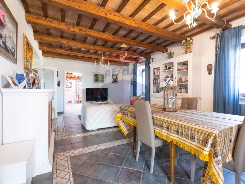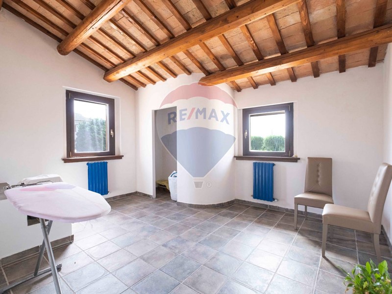 Al centro all' ampio soggiorno con un grande camino, sapientemente restaurato con gusto. ed ingresso per bagno ed antibagno .Proseguendo dal soggiorno accediamo alla sala studio con libreria arricchita da una ulteriore stanza pluriuso predisposta anche per bagno ed attualmente usata come lavanderia.