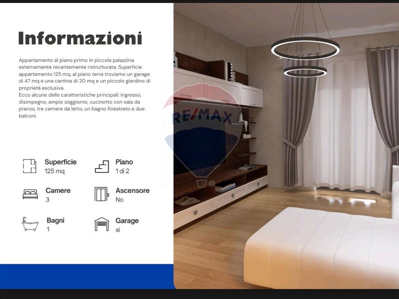 Appartamento al piano primo in piccola palazzina esternamente recentemente ristrutturata. Superficie appartamento 125 mq, al piano terra troviamo un garage di 47 mq e una cantina di 20 mq e un piccolo giardino di proprietà esclusiva.