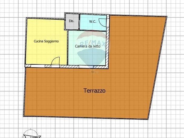 Varcato il portone di ingresso troviamo una cucina soggiorno con affaccio sul terrazzo. A seguire la camera da letto matrimoniale, anch'essa con affaccio sul terrazzo ed il servizio con vasca.