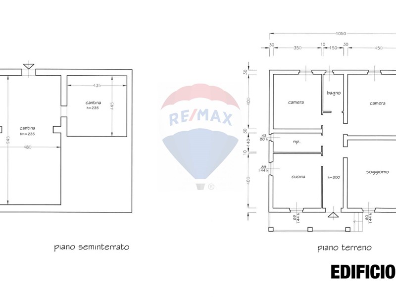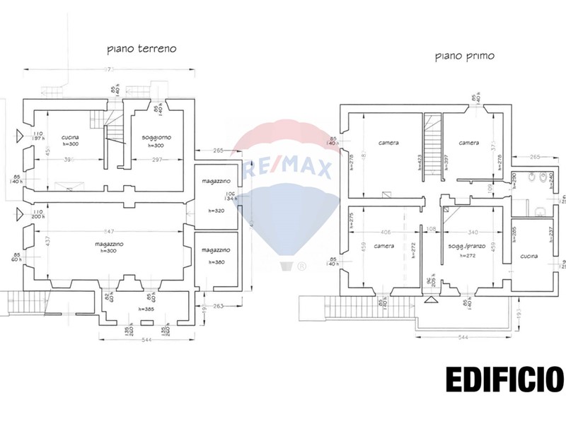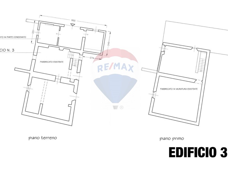 - Edificio 1, unità per civile abitazione, libera su 4 lati, con una superficie di 270 mq, su due livelli e suddiviso in due appartamenti. Al piano terra tre locali più cantine, mentre al primo piano, con accesso da scala esterna troviamo un 4 vani più cucinotto e bagno. i due appartamenti sono comunque uniti da scala interna.