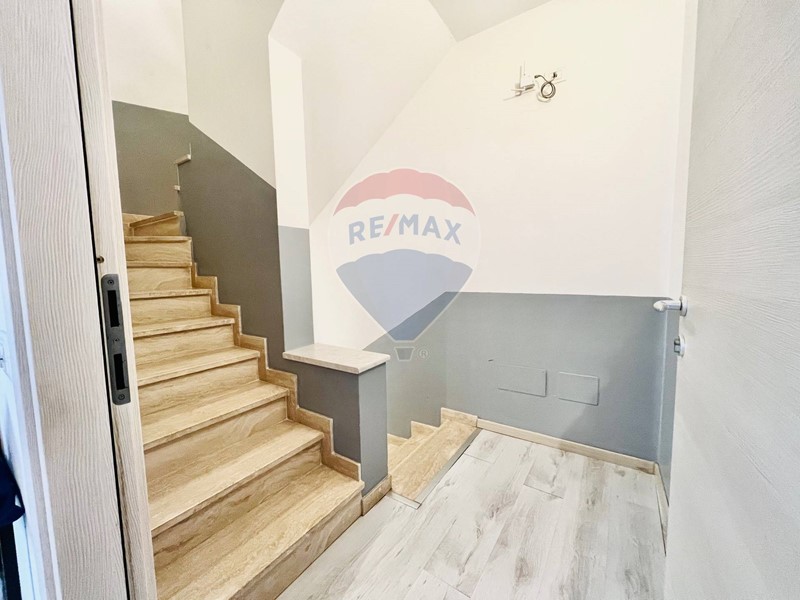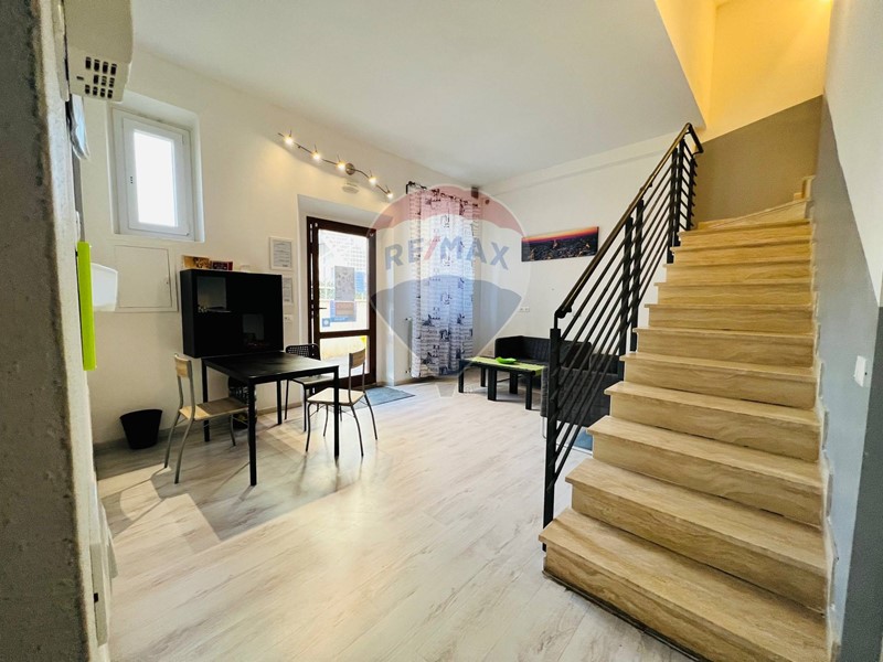 La scala a giorno conduce al primo piano, dove si trova una spaziosa Camera da Letto dotata di Bagno Privato, garantendo comfort e privacy.