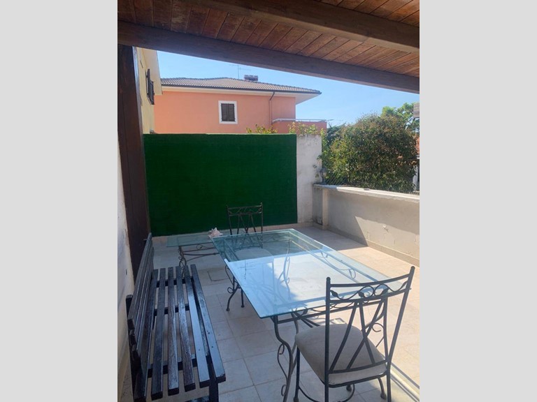 Composto da : Soggiorno con angolo cottura, due camere, bagno , terrazzo con pergola e giardino privato.