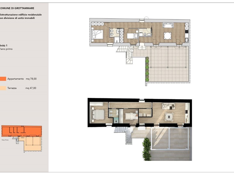 di mq. 78 con adiacente terrazzo di mq. 47, composto da ingresso su soggiorno con cucina vista e terrazzo, 2 camere 2 bagni.