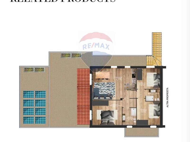 INGRESSO SU SOGGIORNO CON ANGOLO COTTURA, CAMERA MATRIMONIALE, 2 CAMERE SINGOLE, 2 BAGNI, LOCALE TECNICO E GARAGE DI 42MQ.