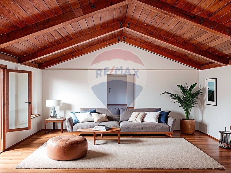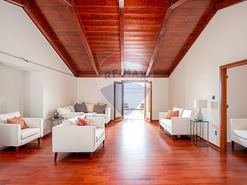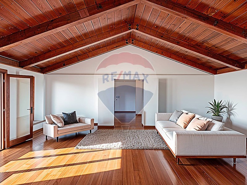 L'ampio salone, caratterizzato da un elegante pavimento in legno lucido, pareti finemente tinteggiate e soffitti in legno è il cuore pulsante della casa.