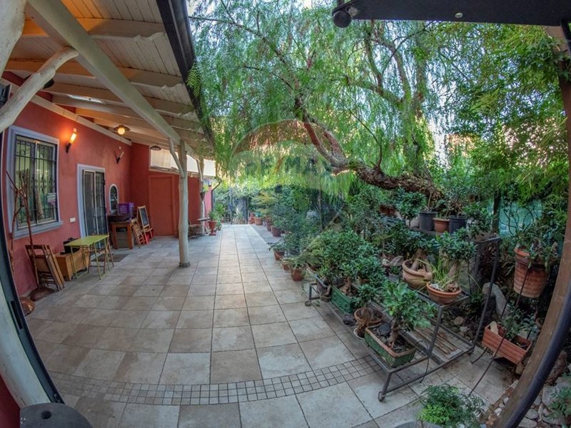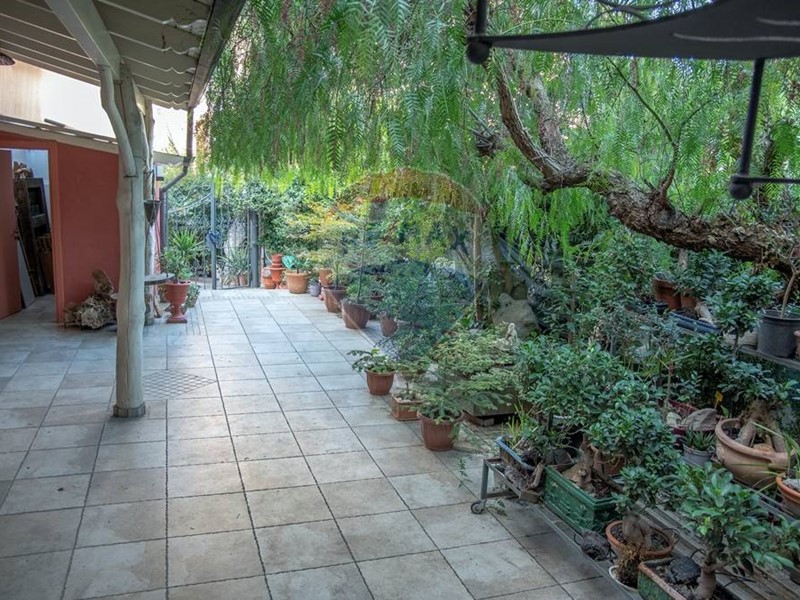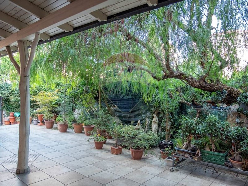 giardino con piante, alberi e rocce, pavimentato e con tettoia con travi di legno e magazzino attrezzi;