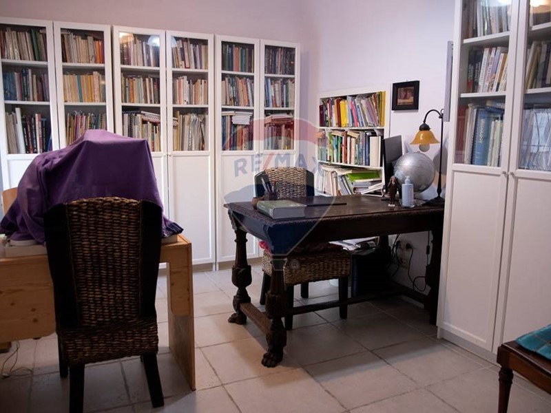 ampio disimpegno da cui si accede ad una sala biblioteca con vetrata e due bagni;