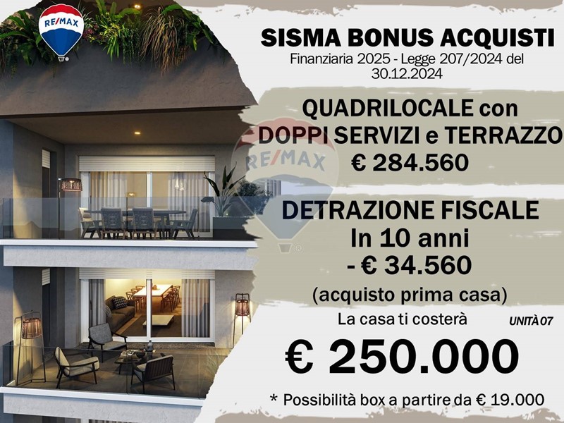 Grazie all'intervento di demolizione e ricostruzione, avrete la possibilità di accedere al SISMA BONUS ACQUISTI con DETRAZIONE IRPEF in 10 ANNI (il prezzo esposto è già dedotto dell'importo relativo al sisma bonus acquisti, pari ad 34.560 per acquisto prima casa).