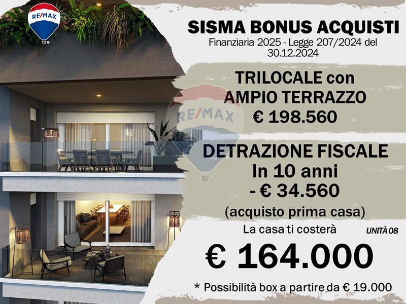 Grazie all'intervento di demolizione e ricostruzione, avrete la possibilità di accedere al SISMA BONUS ACQUISTI con DETRAZIONE IRPEF in 10 ANNI (il prezzo esposto è già dedotto dell'importo relativo al sisma bonus acquisti, pari ad 34.560 per acquisto prima casa).