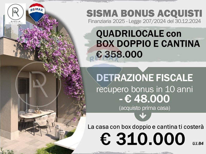Grazie all'intervento di demolizione e ricostruzione, avrete la possibilità di accedere al SISMA BONUS ACQUISTI con DETRAZIONE IRPEF in 10 ANNI (il prezzo esposto è già dedotto dell'importo relativo al sisma bonus acquisti, pari ad 48.000 per acquisto prima casa).