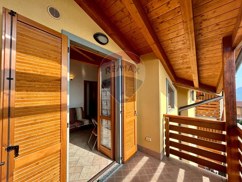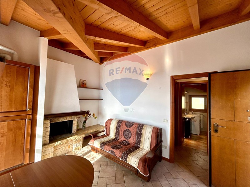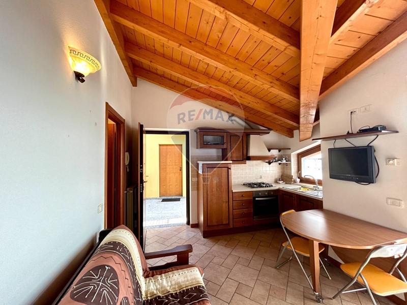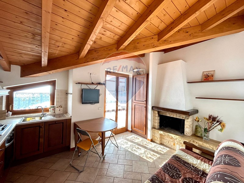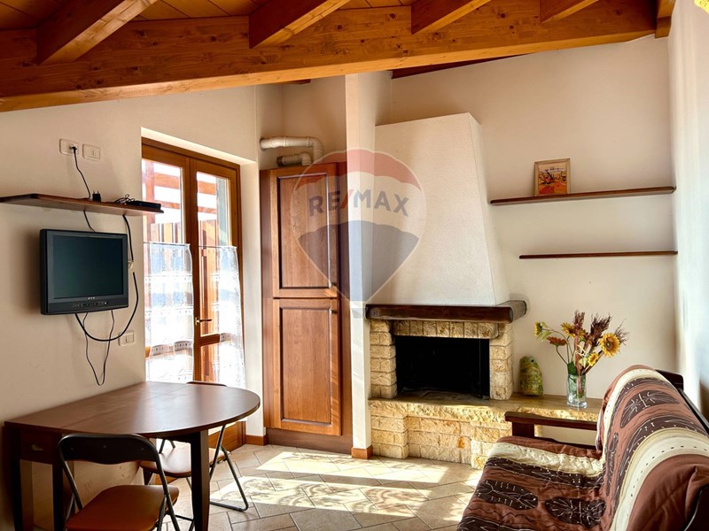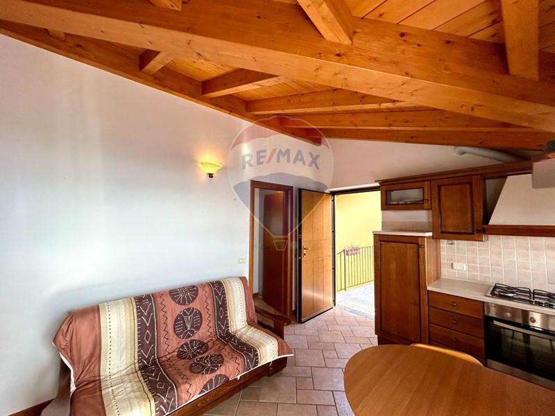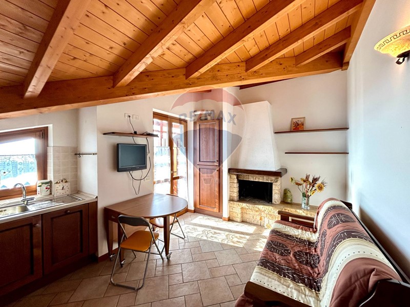 L'appartamento si trova al secondo ed ultimo piano, ha una superficie di 40 mq circa è già arredato e pronto per essere abitato fin da subito ed è composto da soggiorno con cucina a vista e caminetto, disimpegno, camera matrimoniale, bagno con doccia e ampio terrazzo con vista panoramica sulla natura circostante e sul lago. Le travi in legno a vista danno un tocco di calore e carattere all'ambiente.