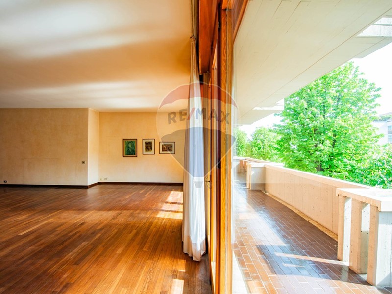 Il grande e luminoso salone è arricchito da vetrate che si affacciano su una splendida terrazza profonda e vivibile, ideale per trascorrere piacevoli momenti all'aria aperta.