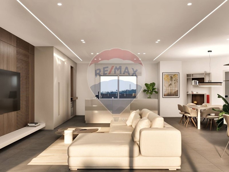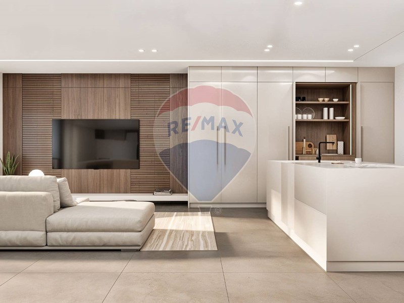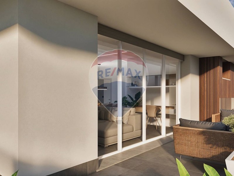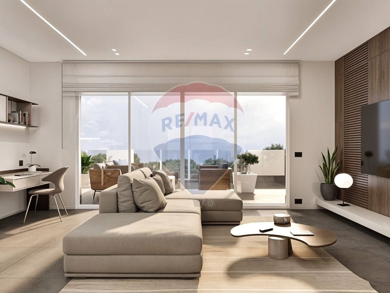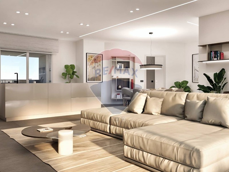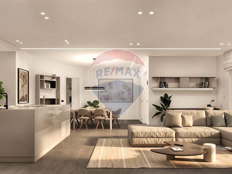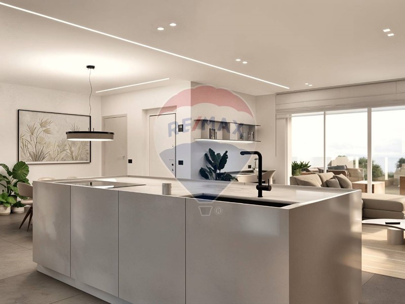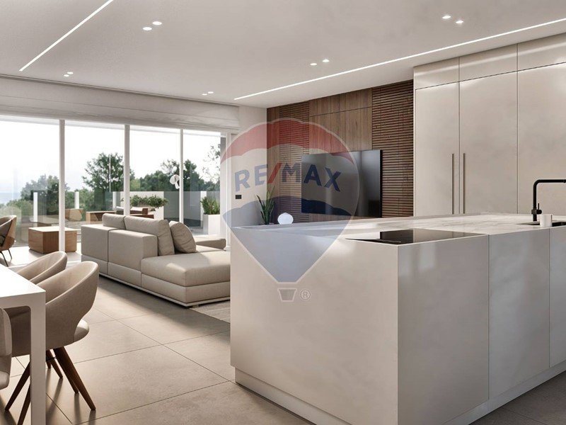 Ampio soggiorno open space con cucina a vista e accesso diretto a un grande terrazzo vivibile