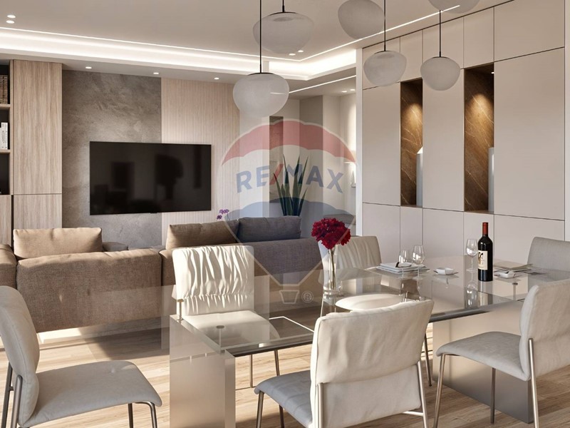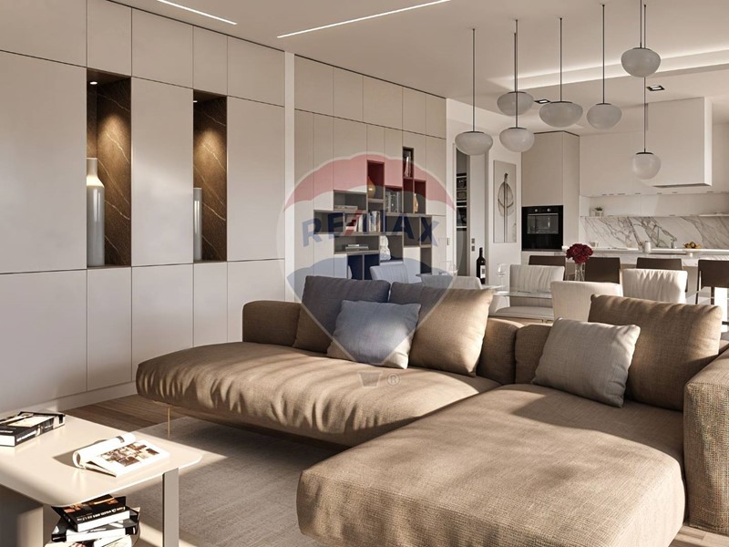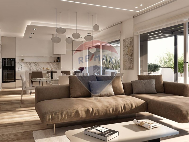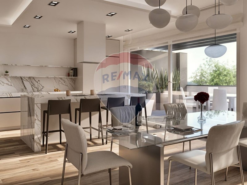 La zona giorno open space, ampiamente esposta a sud, è illuminata da grandi vetrate che si affacciano su un terrazzo di circa 50 mq: perfetto per cene allaperto, relax e momenti conviviali in ogni stagione.