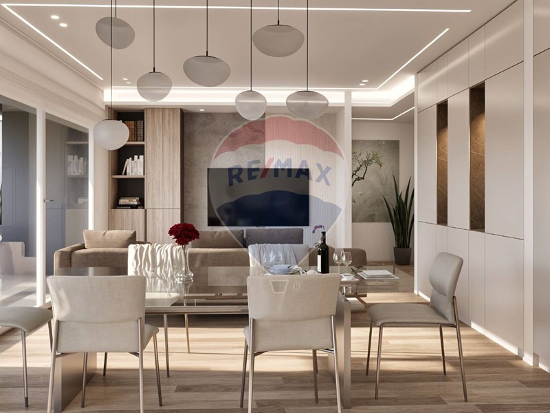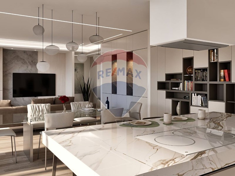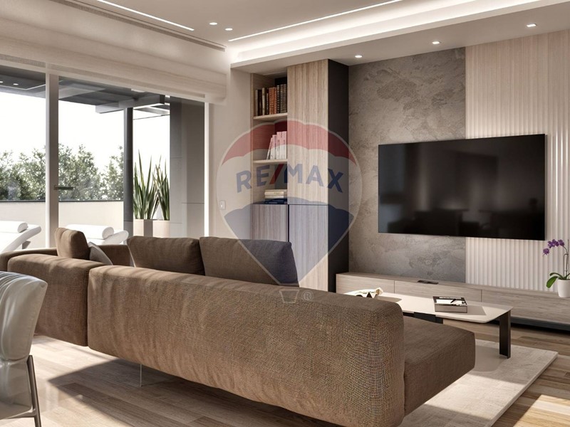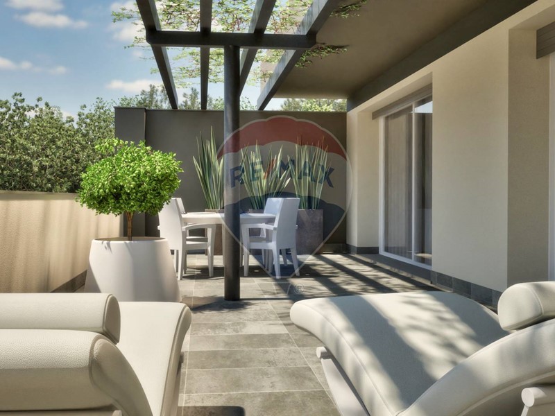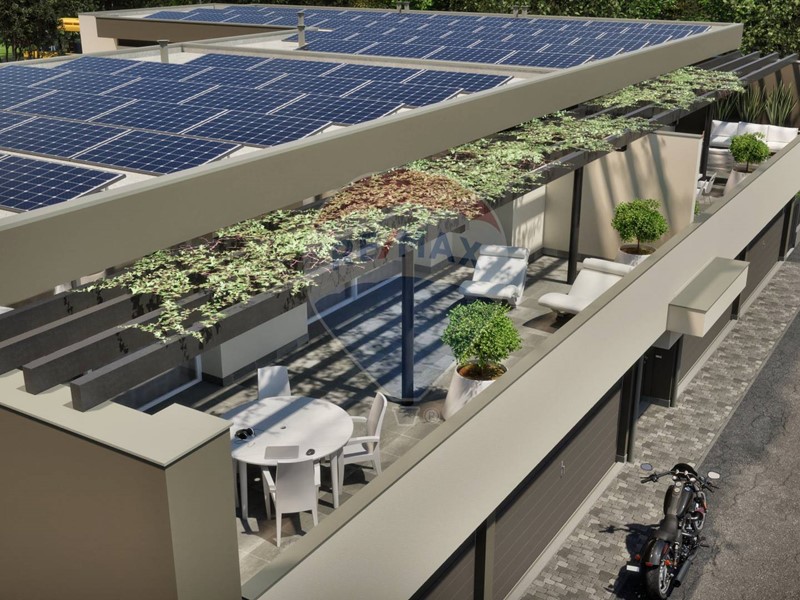 La zona giorno open space, ampiamente esposta a sud, è illuminata da grandi vetrate che si affacciano su un terrazzo di circa 50 mq: perfetto per cene allaperto, relax e momenti conviviali in ogni stagione.