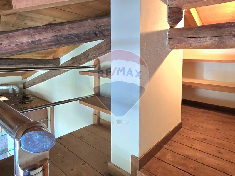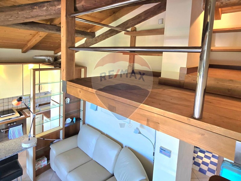 C'è una parte soppalcata, ideale spazio extra raggiungibile con una elegante scala in legno, il tutto molto raffinato e scenico, annegato tra superbe travi in legno.